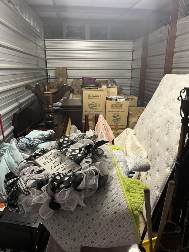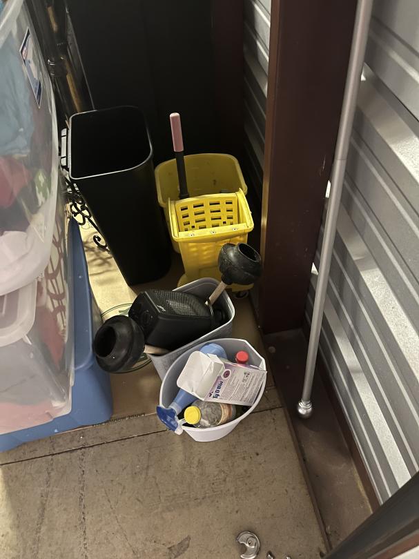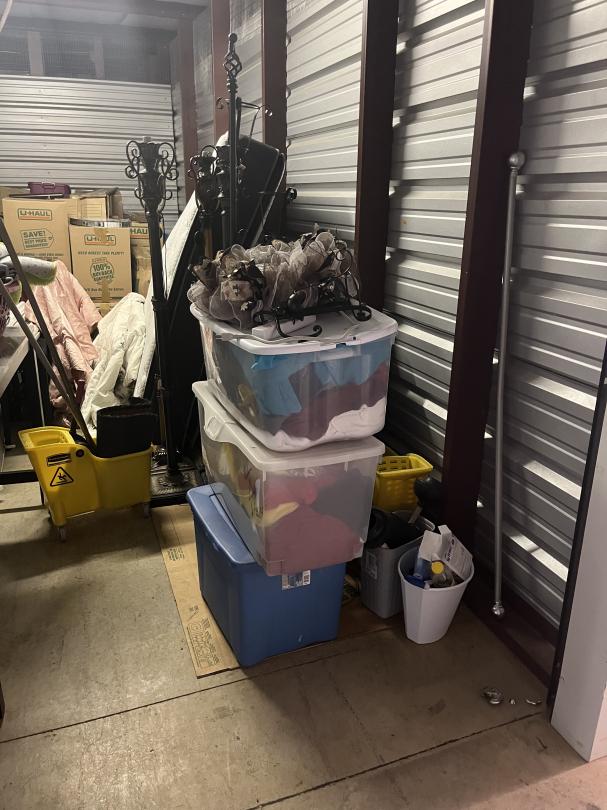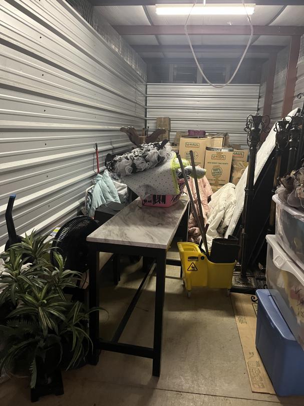 This unit appears to contain…climate controlled sofa table, lamps, plants, boxes, mattress, box spring, kitchen table, microwave, tv, bench, totes, dresser, vacuum, clock, mop bucket