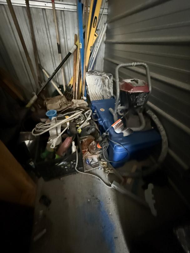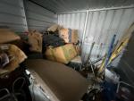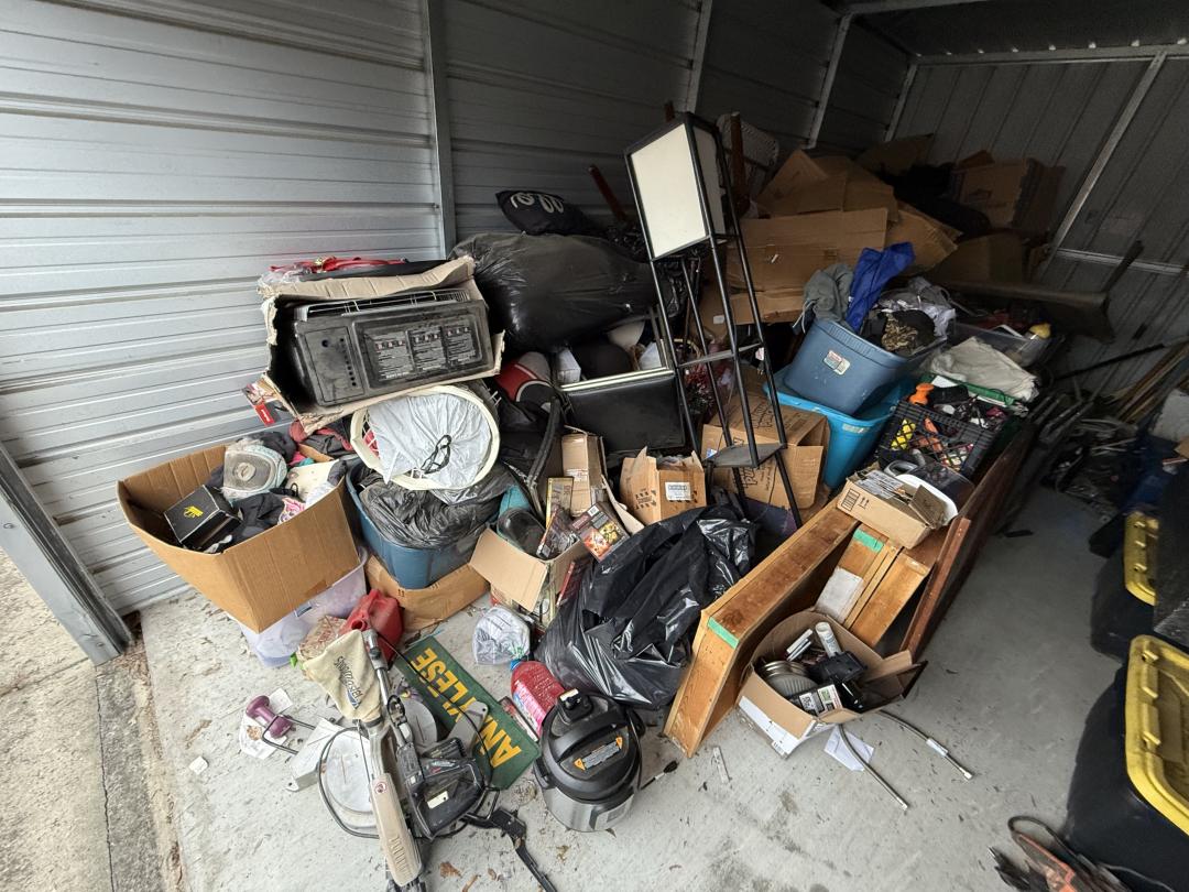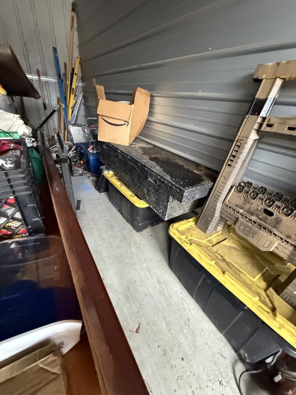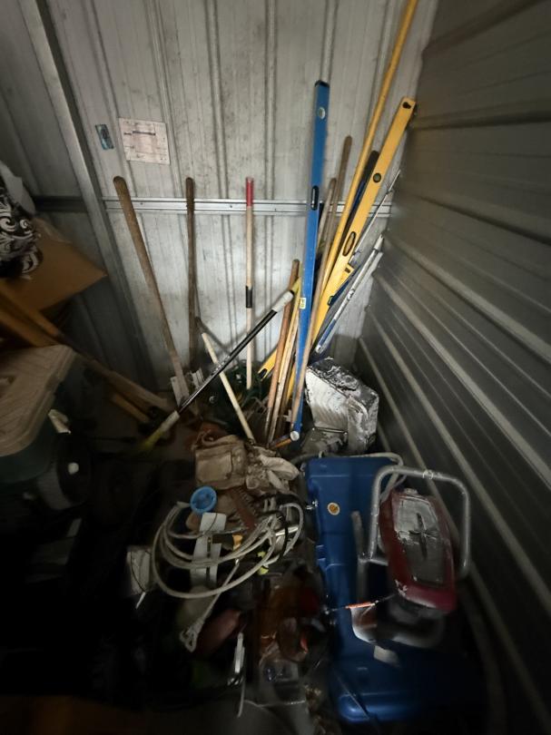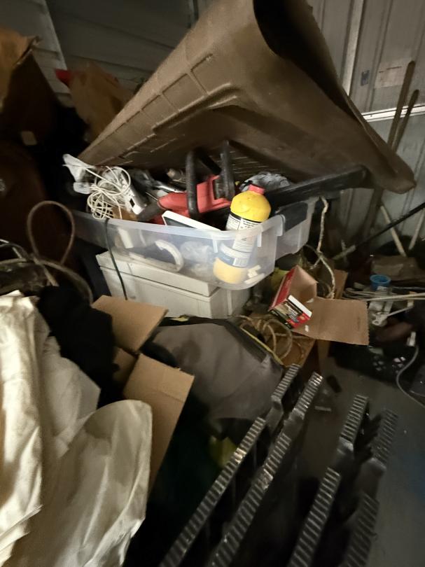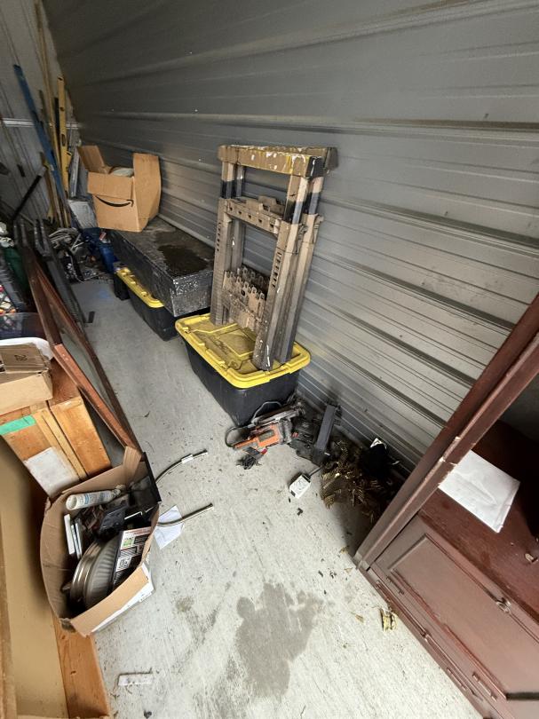 This unit appears to contain…Saw horses, miter saw, truck toolbox, baby car seat, chairs, folding tables, levels, paint sprayer, chainsaw, mirror, boxes and bins, misc