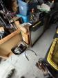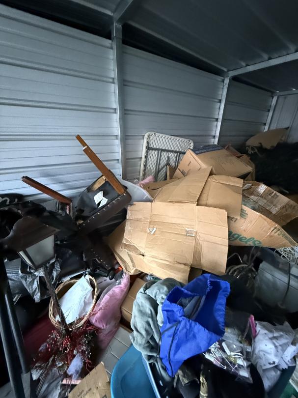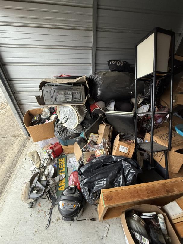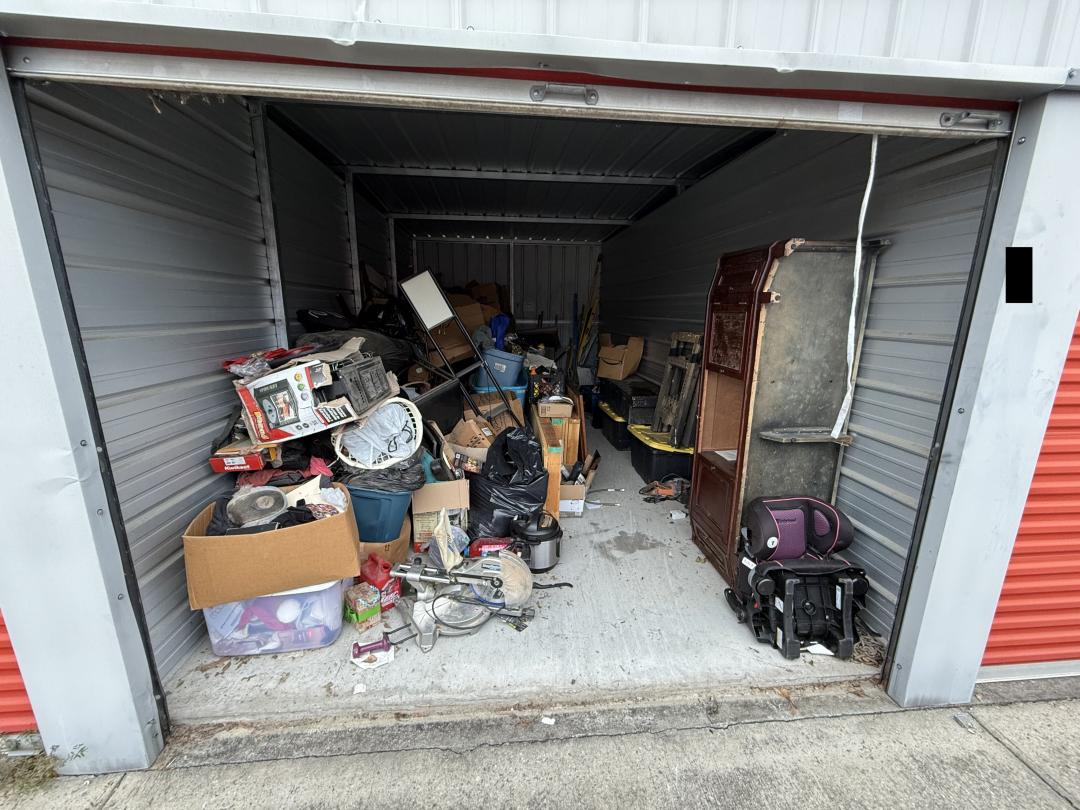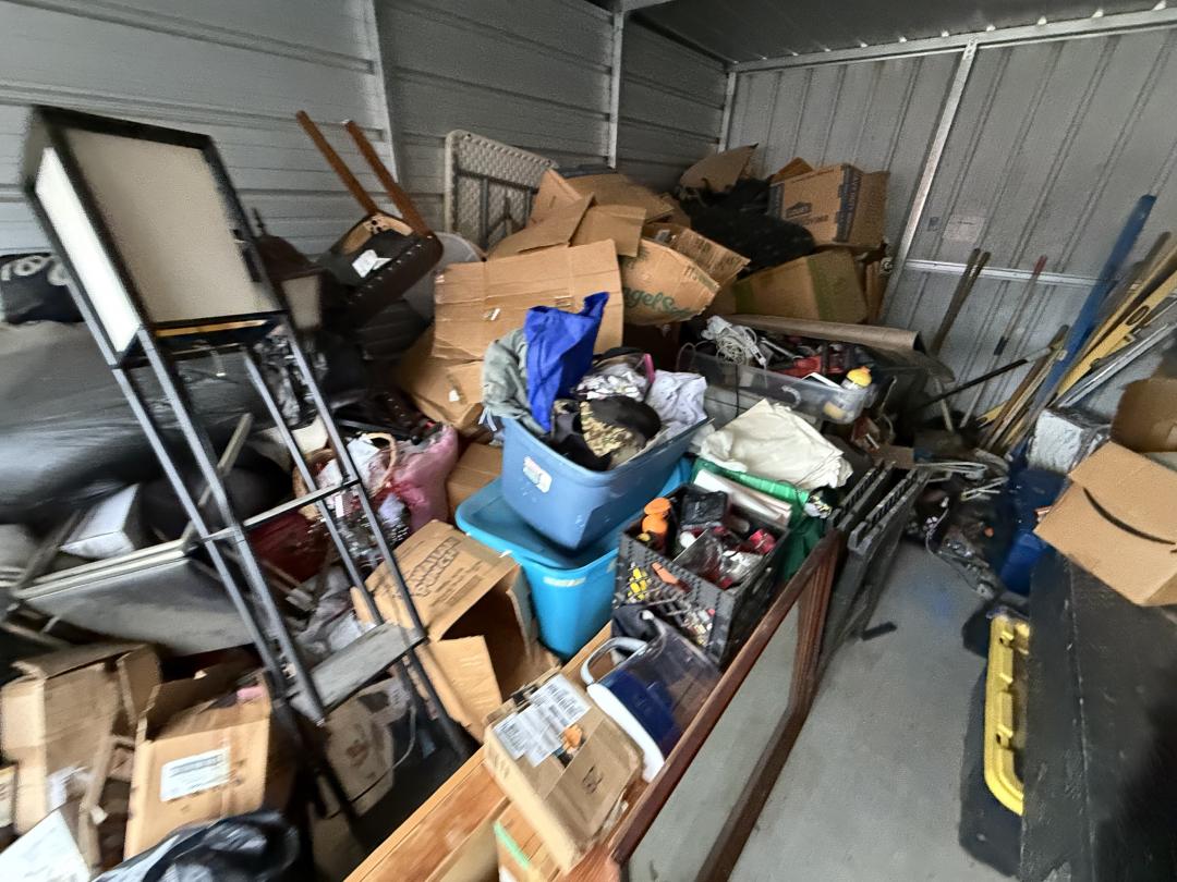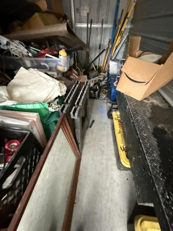 This unit appears to contain…Saw horses, miter saw, truck toolbox, baby car seat, chairs, folding tables, levels, paint sprayer, chainsaw, mirror, boxes and bins, misc