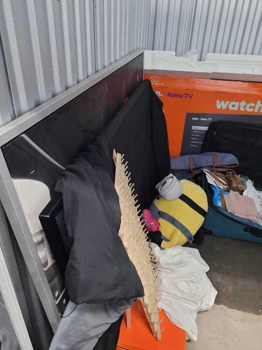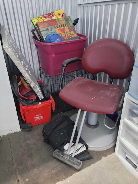 This unit appears to contain…Salon chair, animal crate, clock, TV, misc. household goods