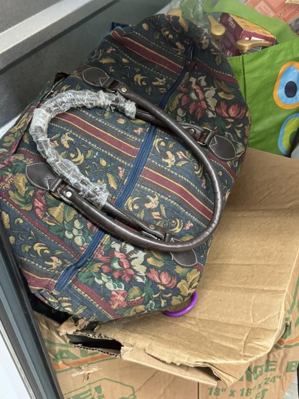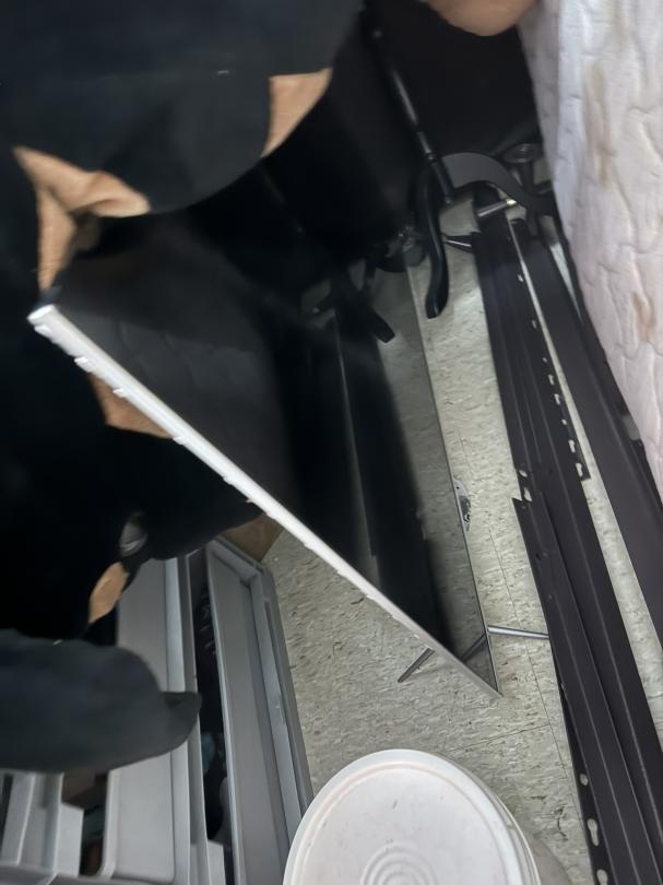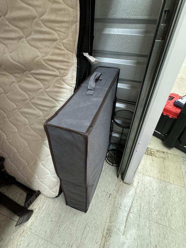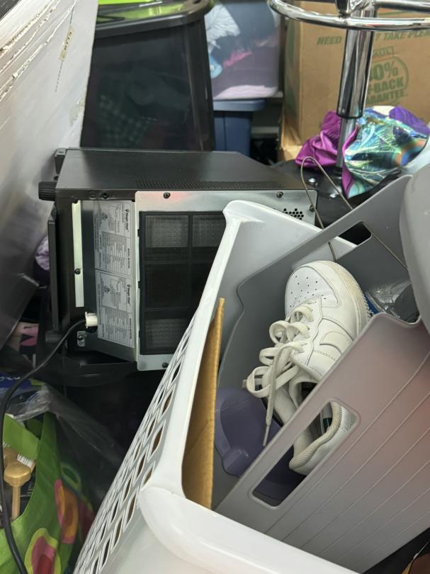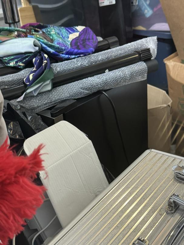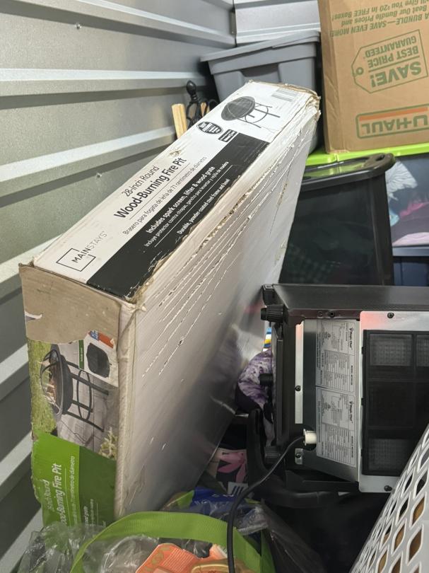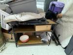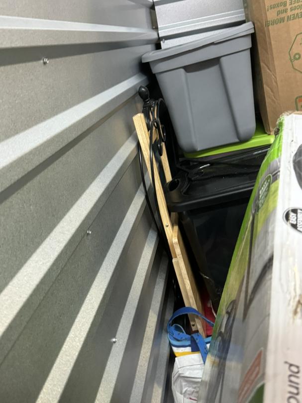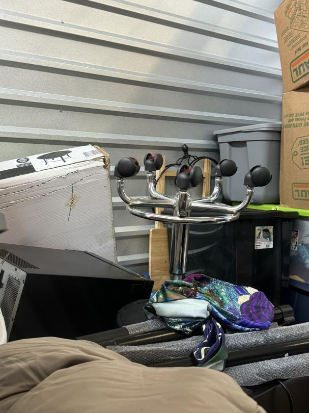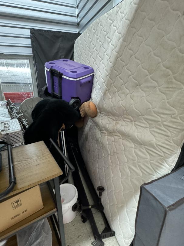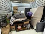 This unit appears to contain…Unit appears to contain: wine refrigerator, roll-a-round stool, hanging chair, TV, cast iron pot, kitchen cutlery table on wheels, mirror, large stuffed animal, cooler, mattresses, bed frame, magic chief cookery, misc. totes and boxes, tote bag