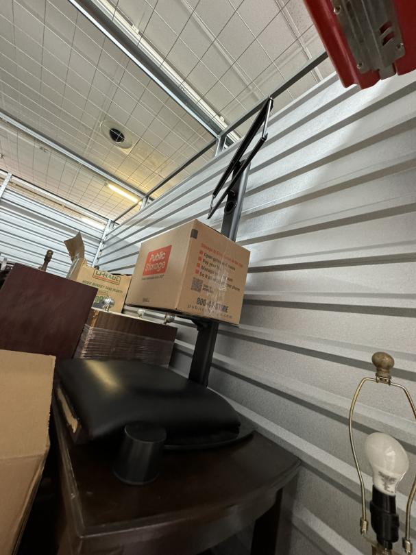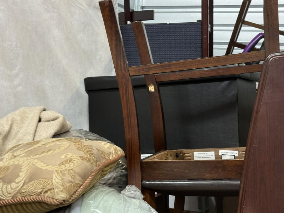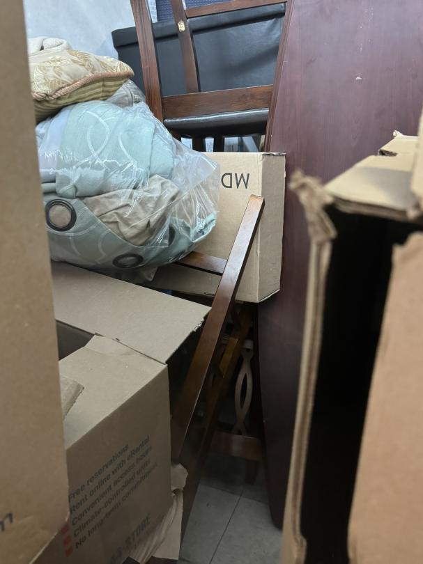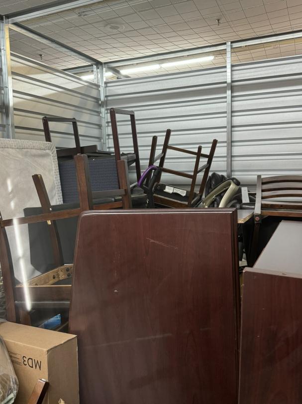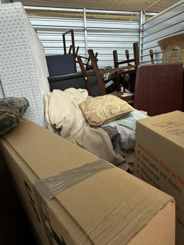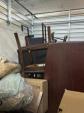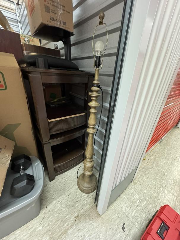 This unit appears to contain…Unit appears to contain: floor lamp, end tables, TV stand, chairs, table, misc. wooden furniture, desk chair, floor cleaner, small ottoman, mattresses, curtains, mattress cover and bedding, misc. boxes, antique/decorative drum, mirror or picture