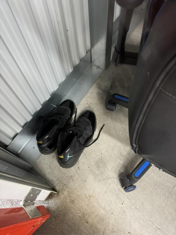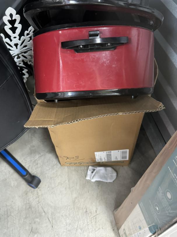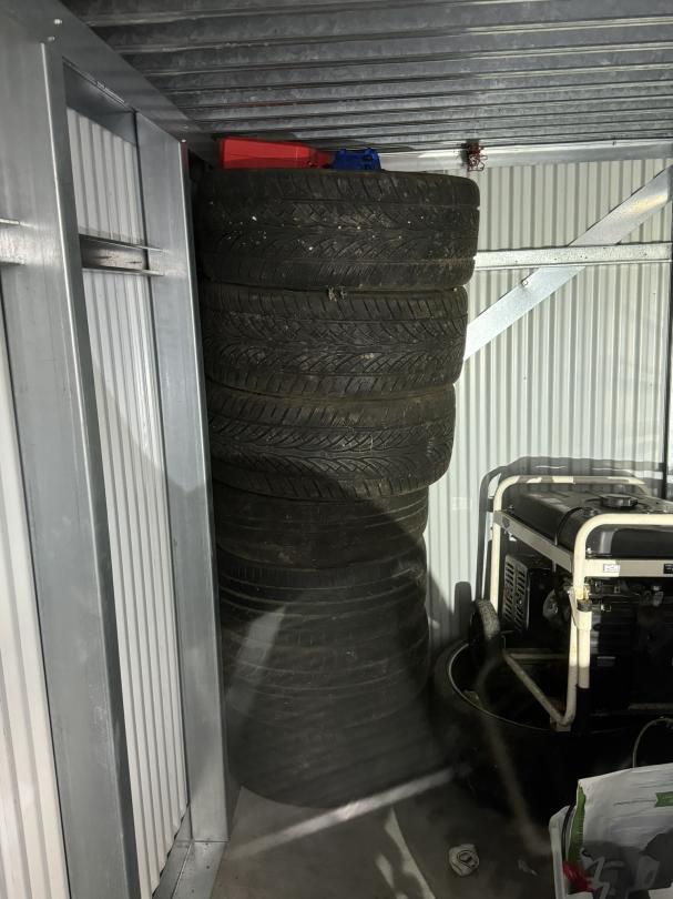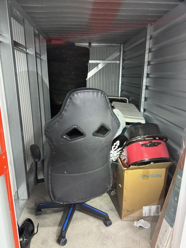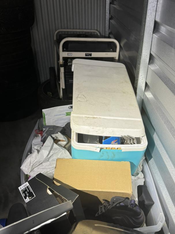 This unit appears to contain…Unit appears to contain: crock-pot, tires, shoes, generator, laminate flooring, desk chair