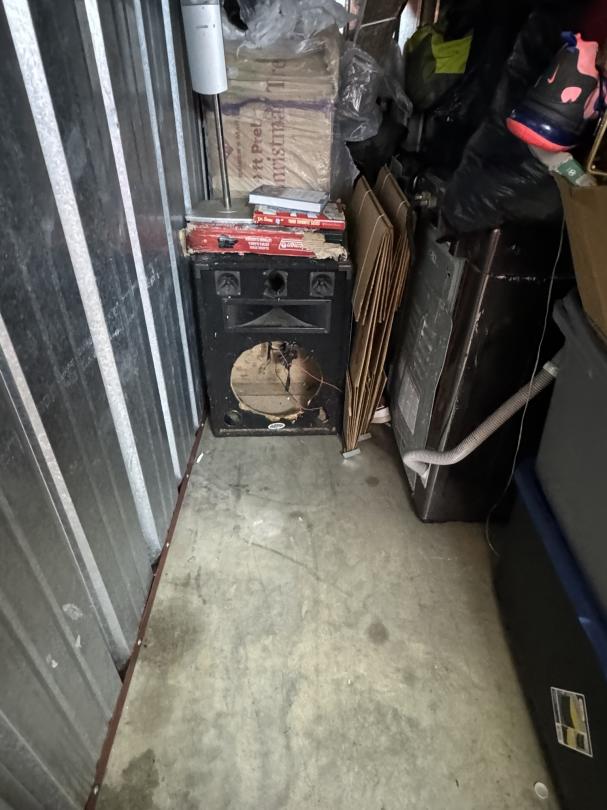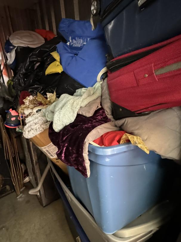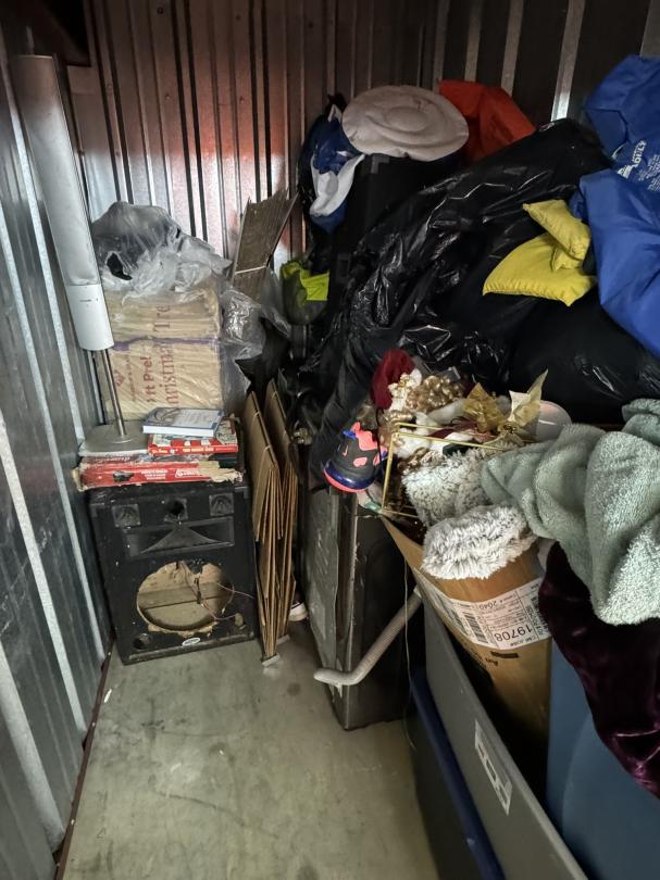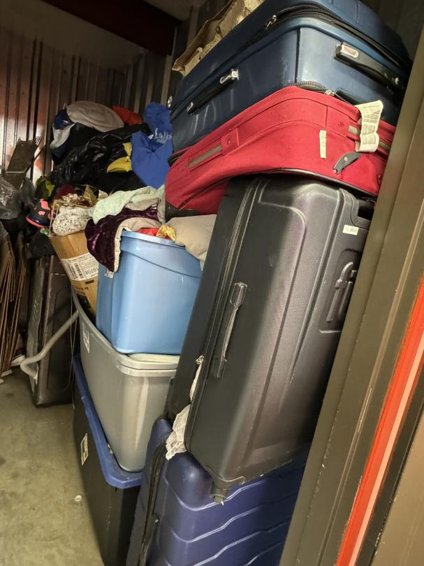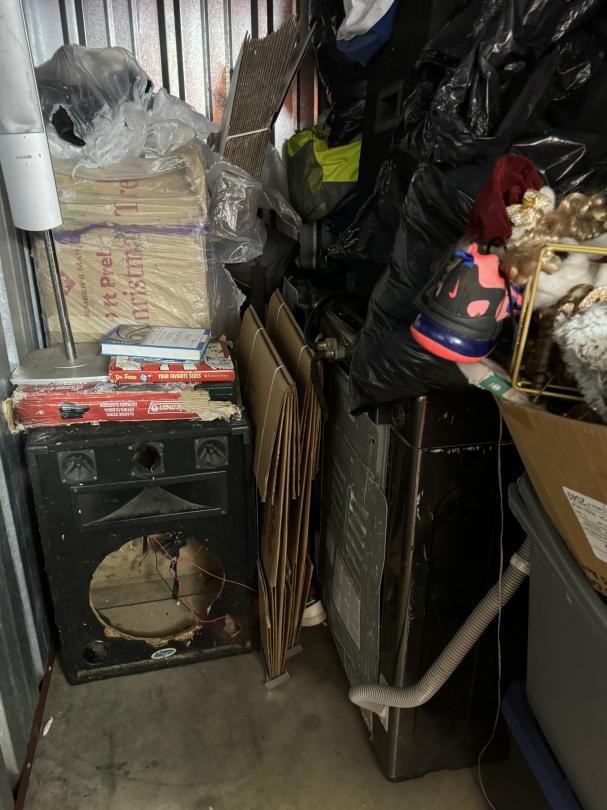 This unit appears to contain…Unit appears to contain: luggage, blankets, Christmas decorations, life jackets, washer and dryer, speakers, duffle bag, books, misc. totes