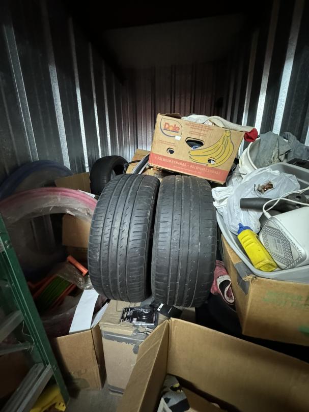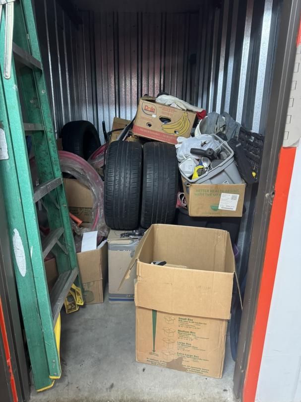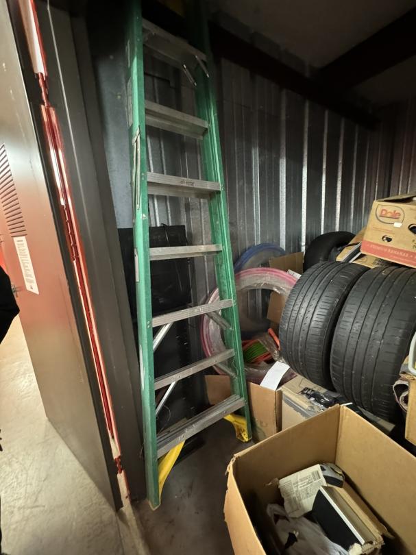 This unit appears to contain…Unit appears to contain: truck tires, ladder, toolbox, misc. tools, clothes, vacuum, weed eater