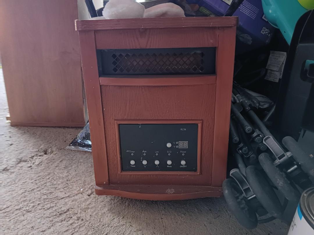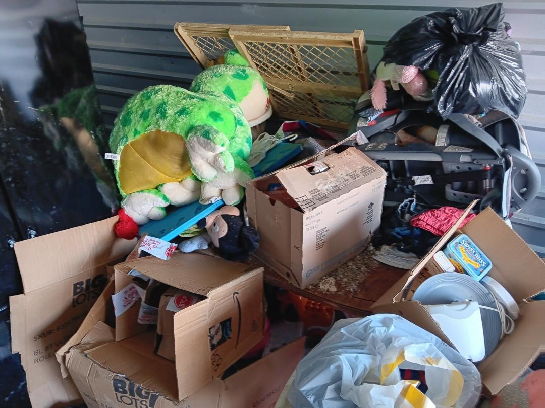 This unit appears to contain…Wooden radio, tall chest, clothes, baby crib, baby goods, electric stove, shelves and miscellaneous.