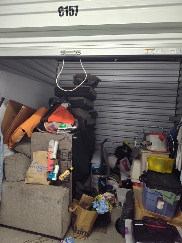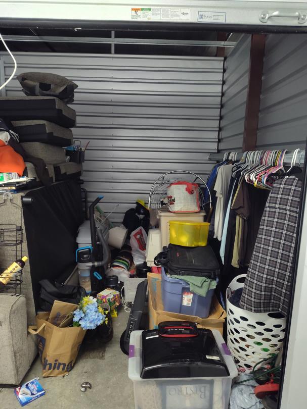 This unit appears to contain…Furniture bed clothes TV boxes totes DVDs shoes