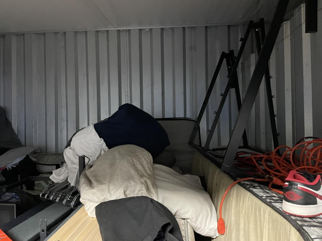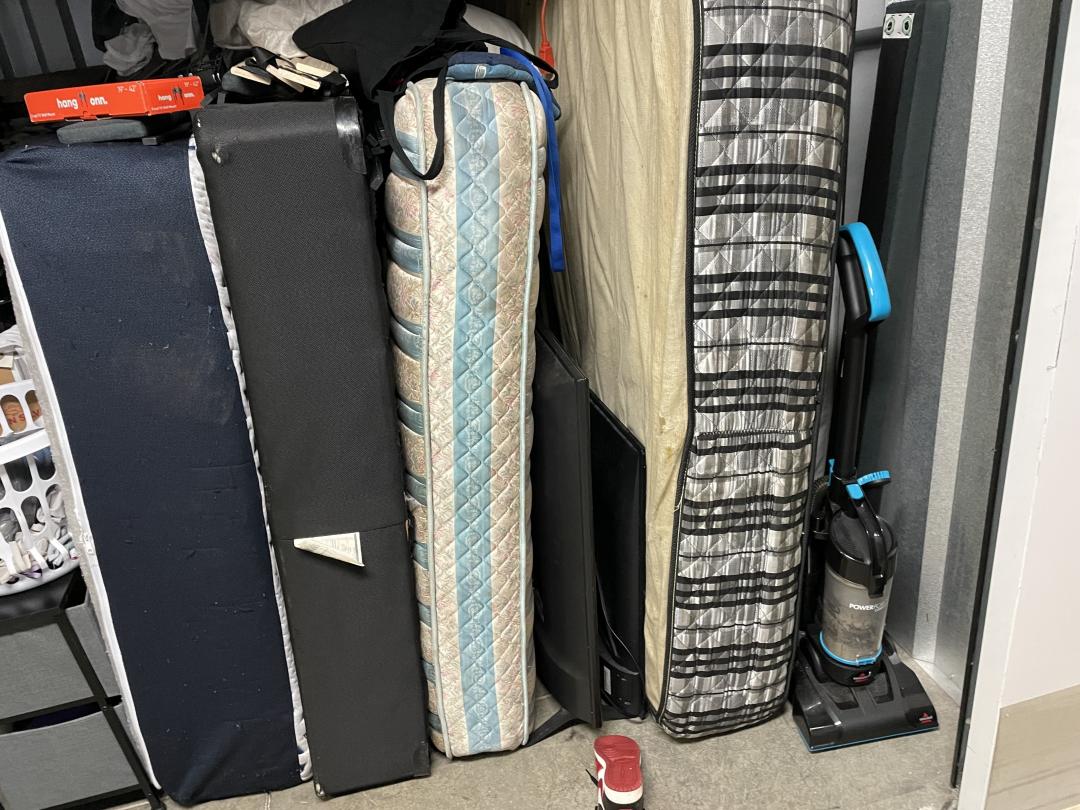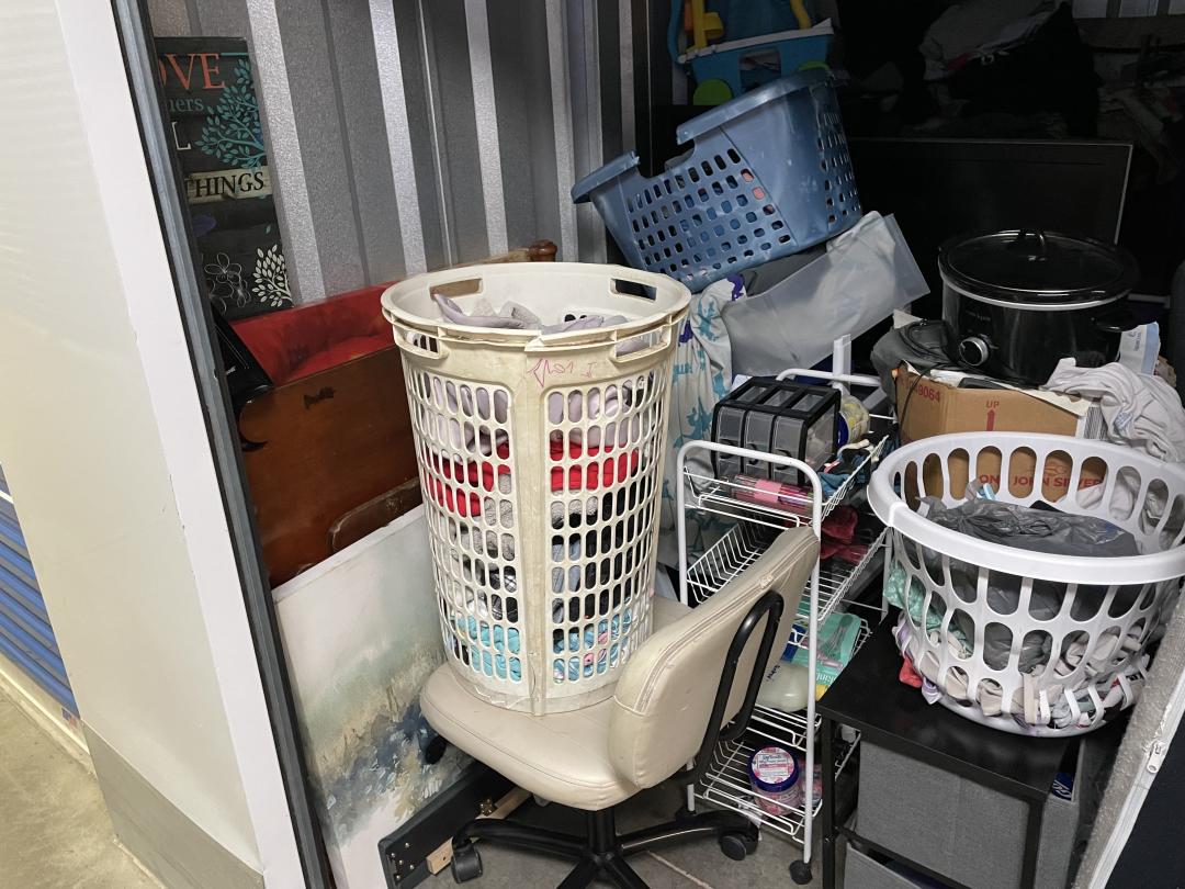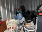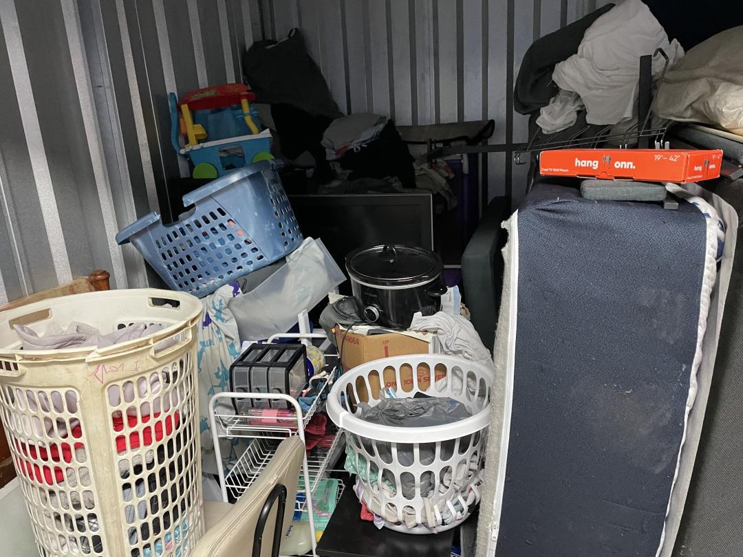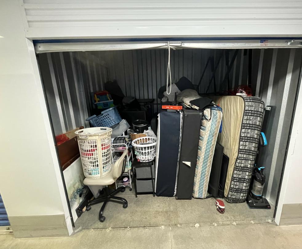 This unit appears to contain…box springs, mattress, TV, bed frame, vacuum, office chair, boxes, bins, decor, toys, crockpot, shoes, household goods, etc.