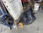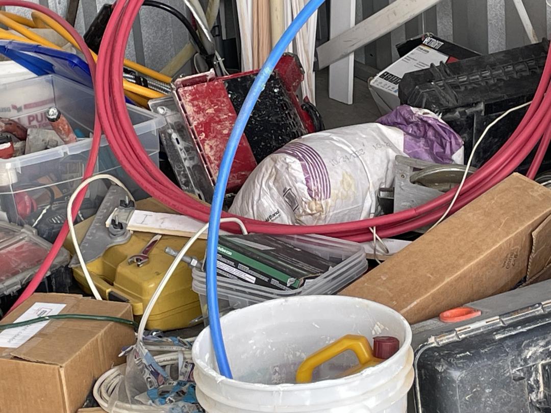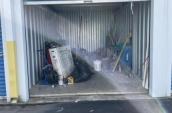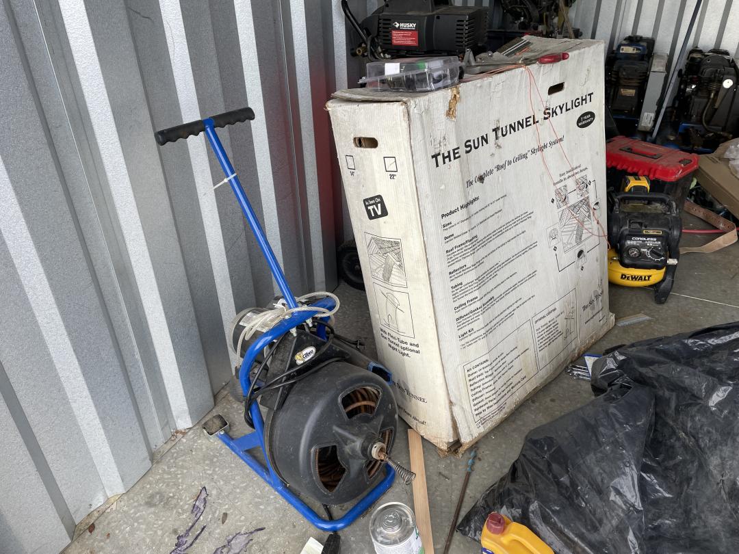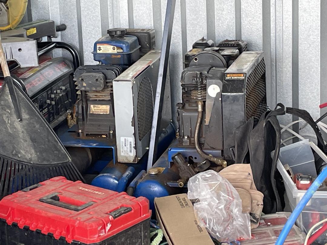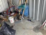 This unit appears to contain…plumbing snake, tank compressors, gas power generator, miter saw, tool boxes, gas powered air compressor, tile saw, wheel barrow, construction tools & material, paint, rake, etc.
