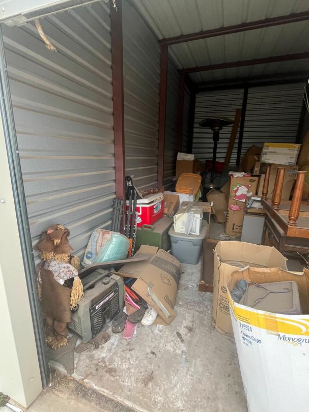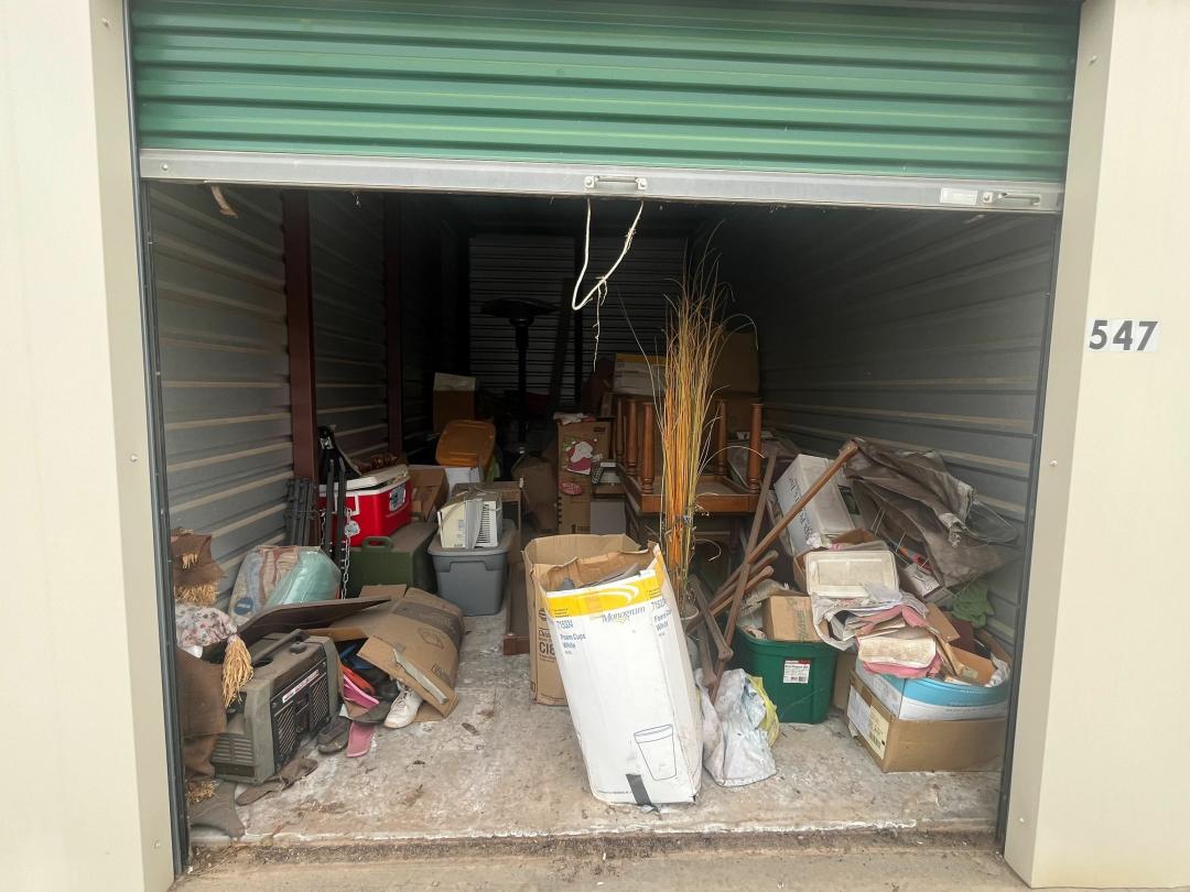 This unit appears to contain…generator, plastic bins, air conditioning unit, boxes, coffee table, lamp