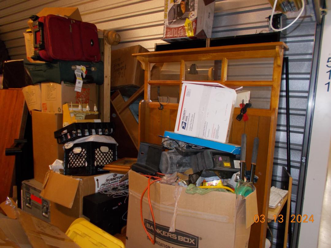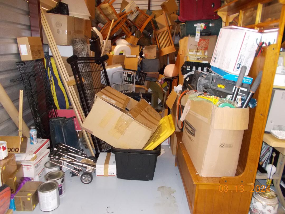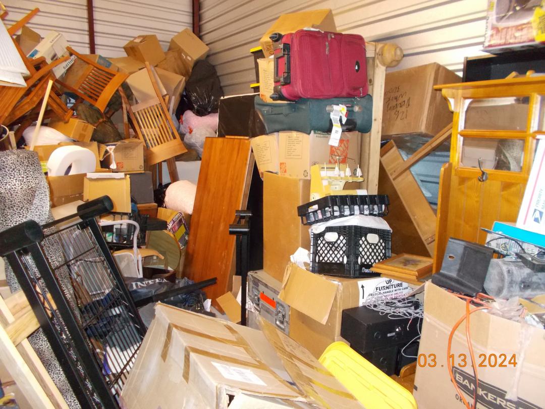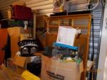 This unit appears to contain…Miscellaneous boxes, chairs, luggage cases, bookshelves, sewing machine, lamp, stereo speakers, BBQ pit, coffee table