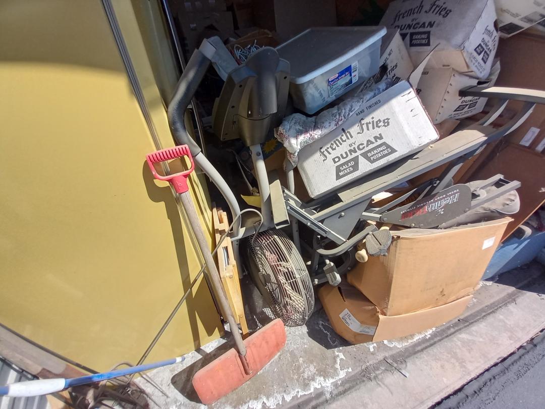 This unit appears to contain…Exercise equipment Boxes Aluminum extension ladder Side by side refrigerator Garden tools Leather suitcase Mirrors Christmas decor