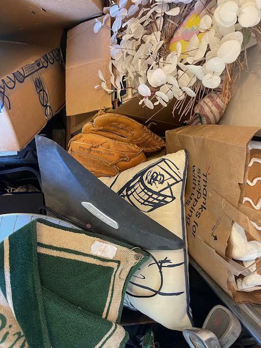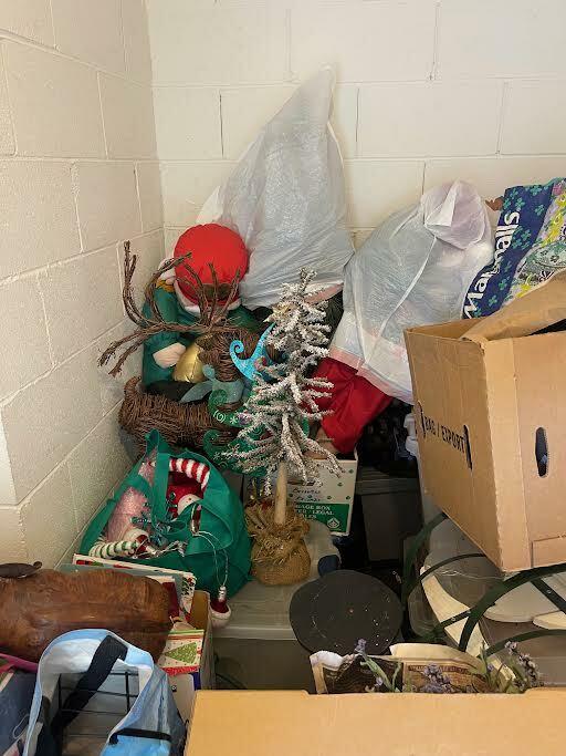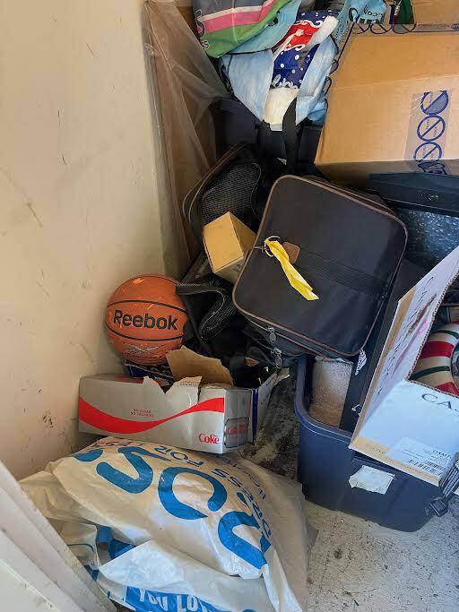 This unit appears to contain…Golf Clubs & Bag, space heater, christmas decorations, basket ball, pillows, household items baseball glove, boxes