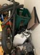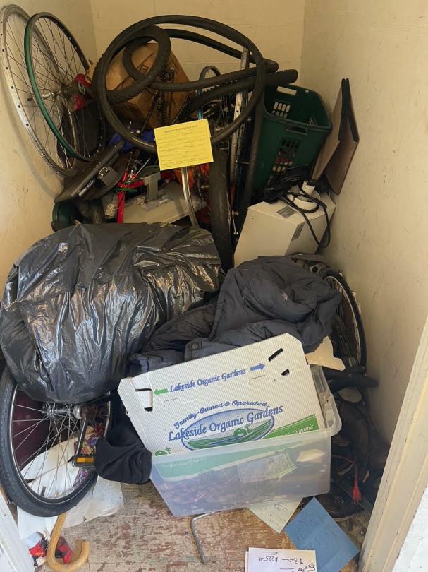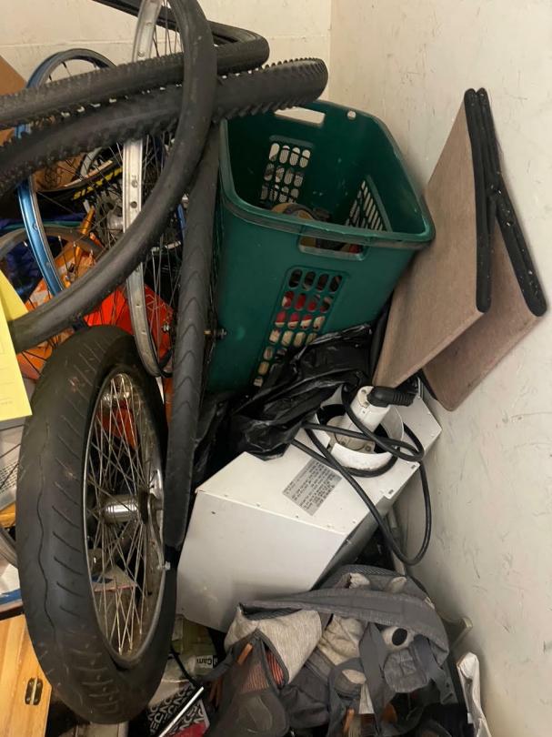 This unit appears to contain…2- Computer monitors, umbrella, clothes, backpack, photos, walking stick, jacket, household goods, boxes, bike parts, tires, rims