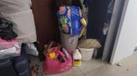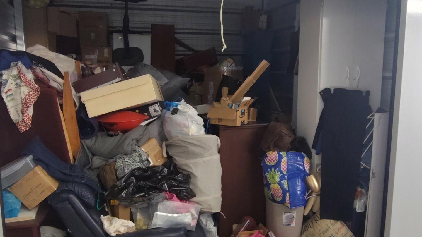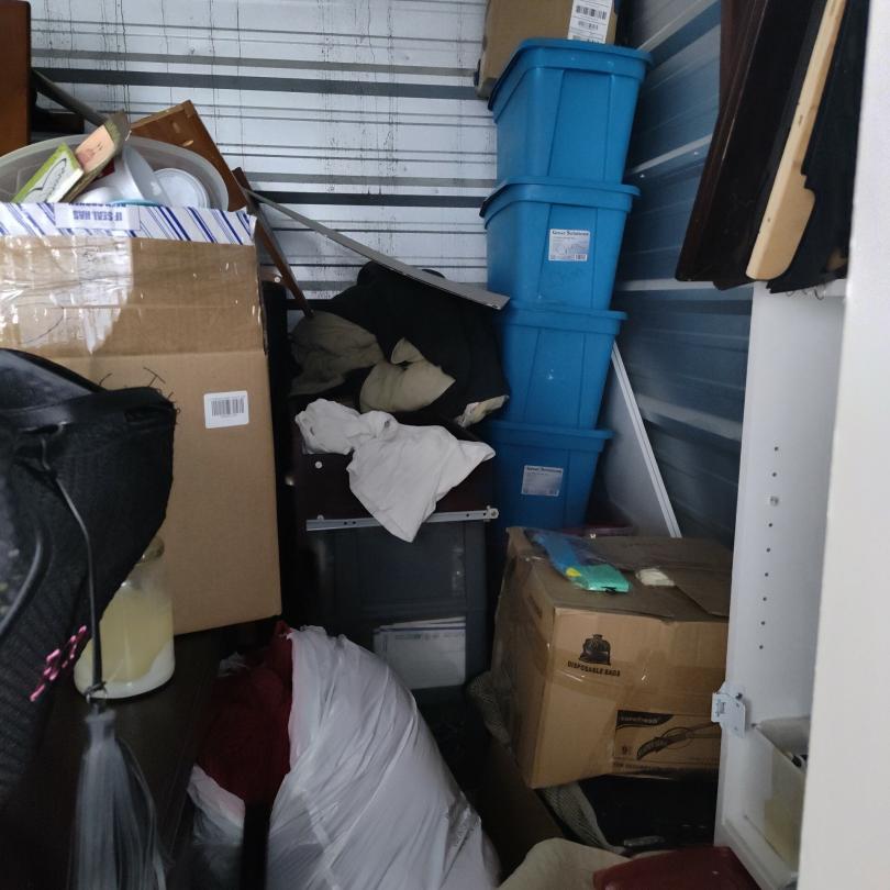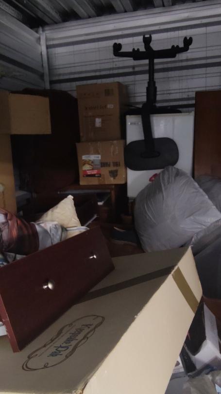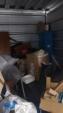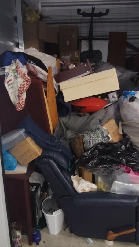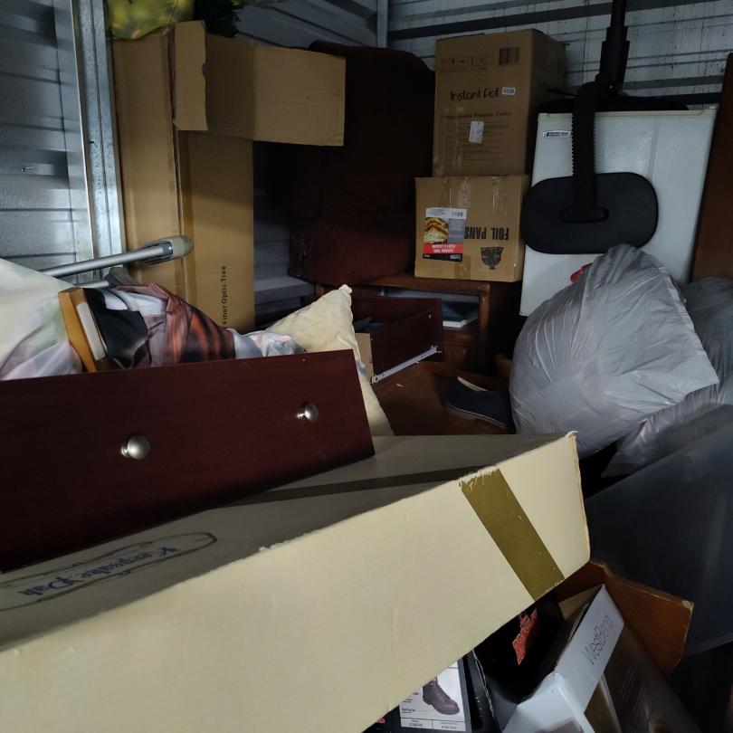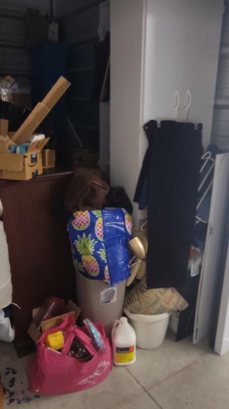 This unit appears to contain…Fridge, computer equipment, chairs, landscaping equip, shelving, dresser, lamps, tables, kitchenware, tv stand, plastic bags and containers, misc boxes, clothing, laundry baskets, recliner, cabinets, desk chair, electric wok, boogie boards.