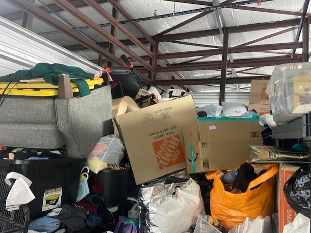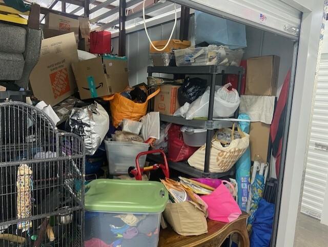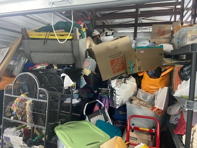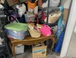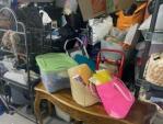 This unit appears to contain…Plastic Containers, Misc. Boxes, TV, Chairs, Misc. Items,
