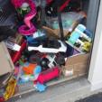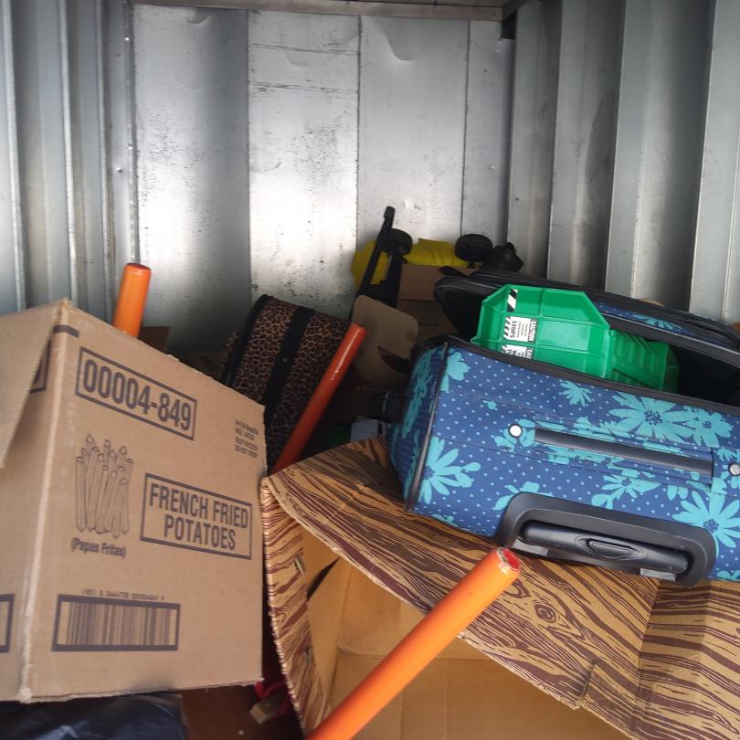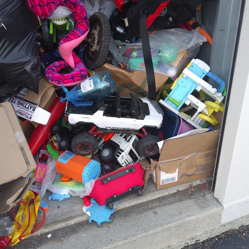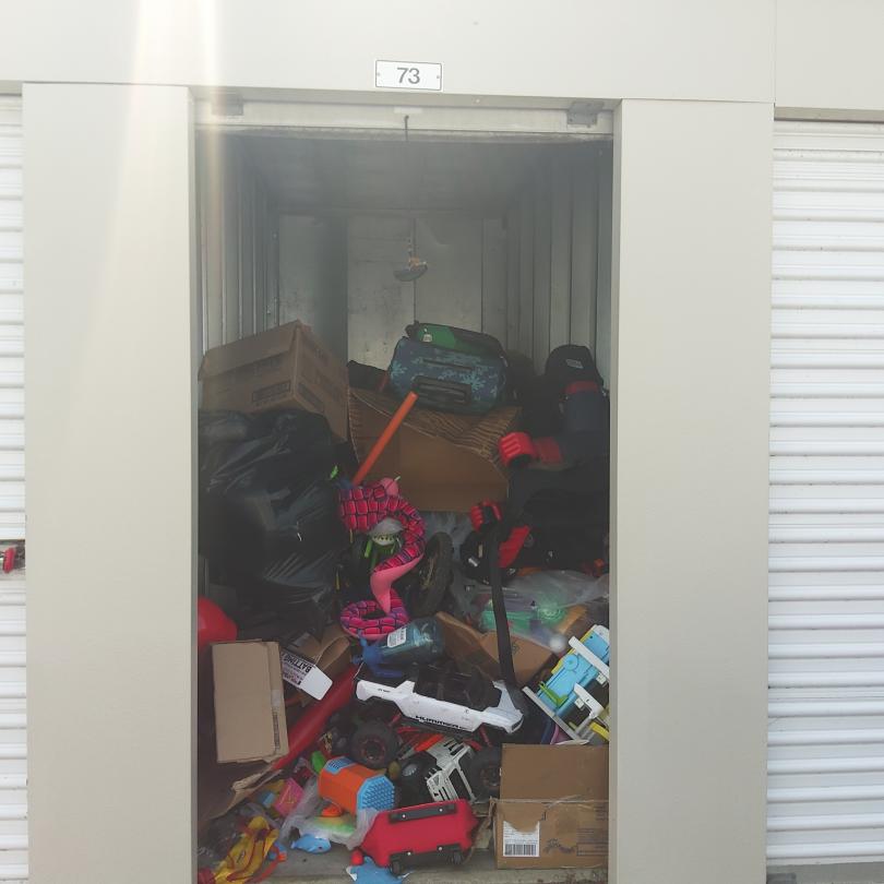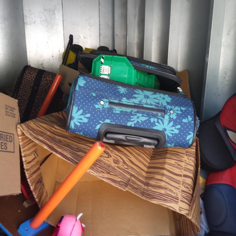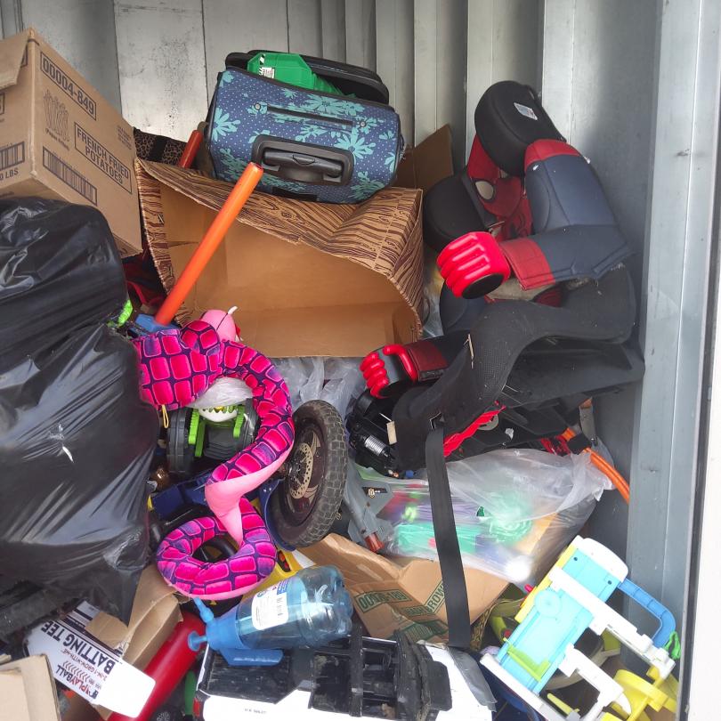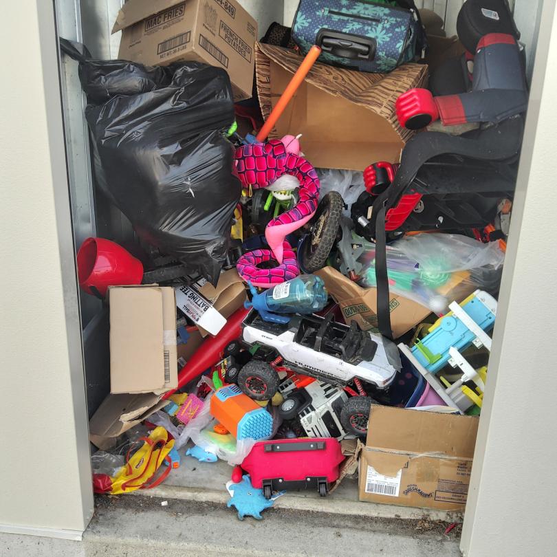 This unit appears to contain…Kids toys, car seat, suitcases, bike, boxes, mystery bags.