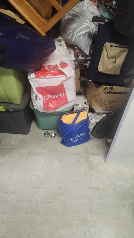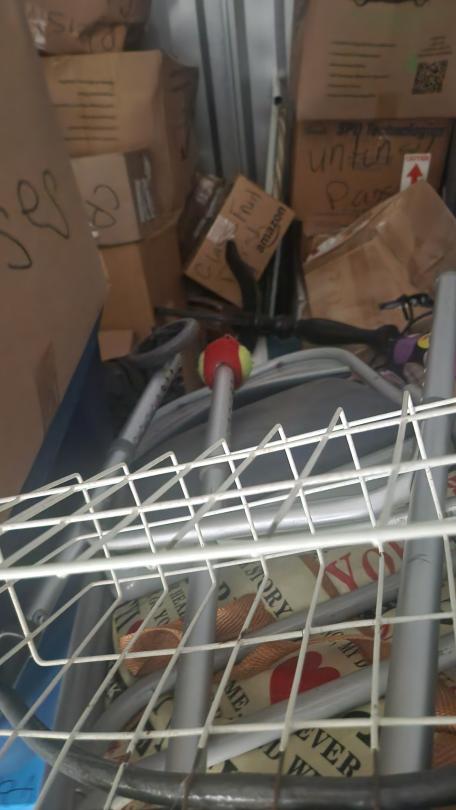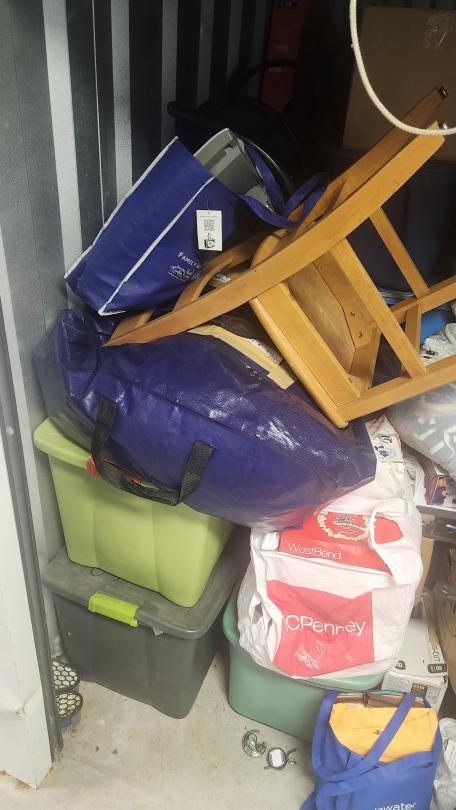 This unit appears to contain…Chairs, totes, bags, walker, bar stool, boxes, misc.
