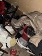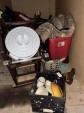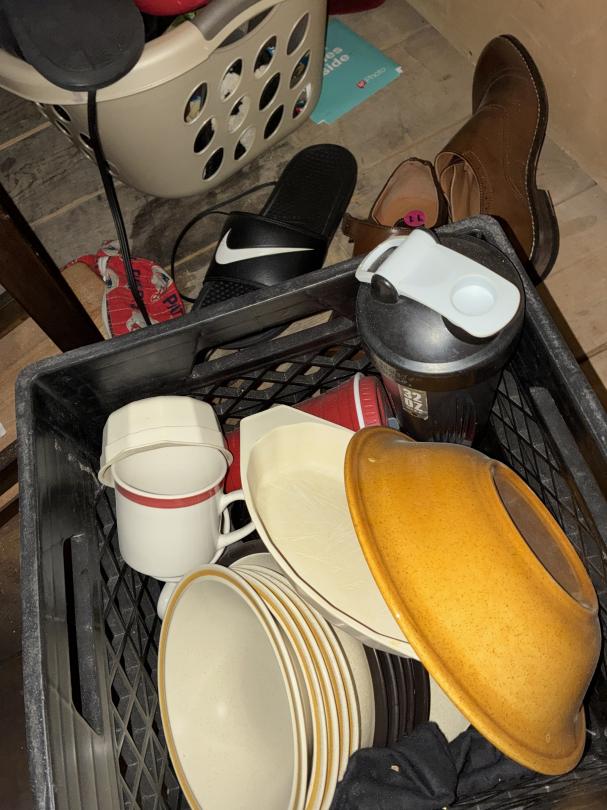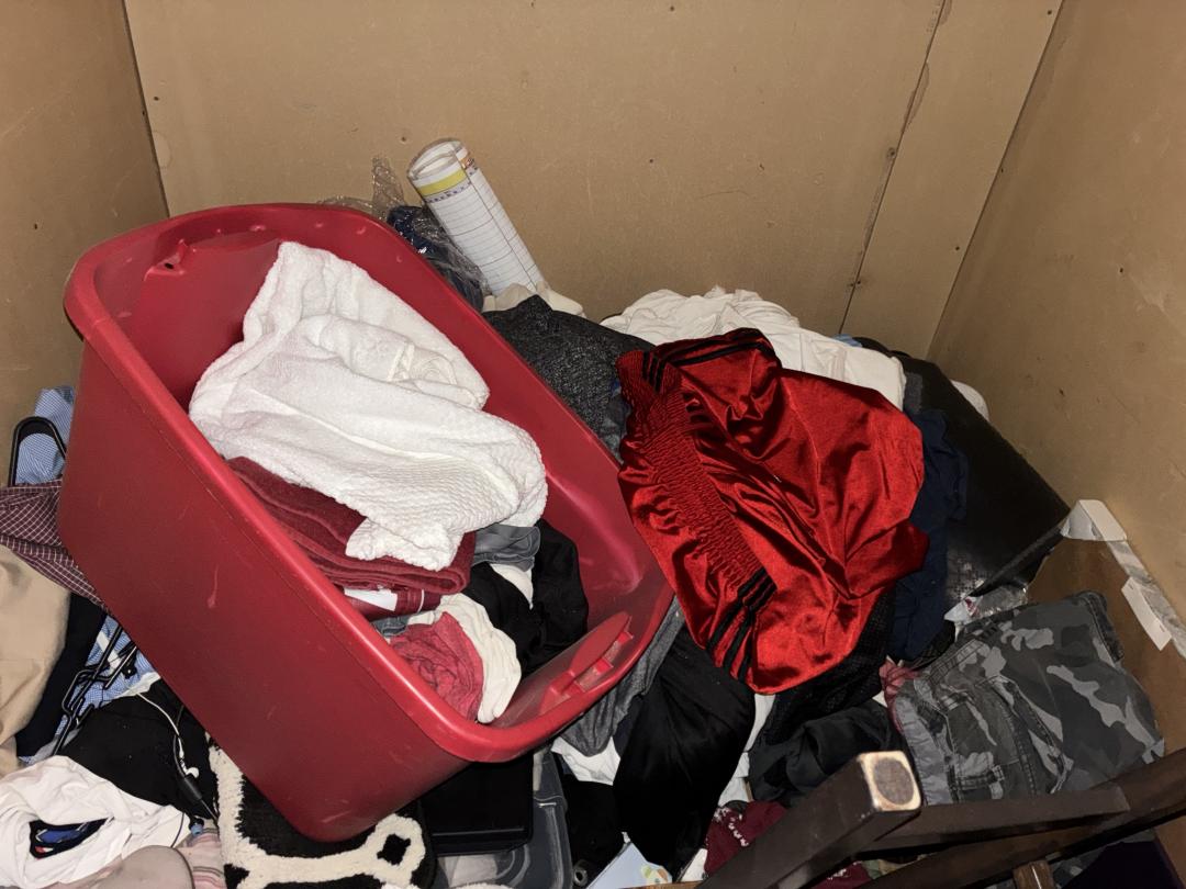 This unit appears to contain…Cloths / Shoes / Kitchenware Stools / Blankets Misc. Household items