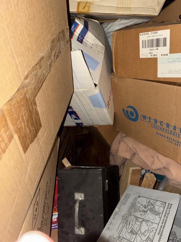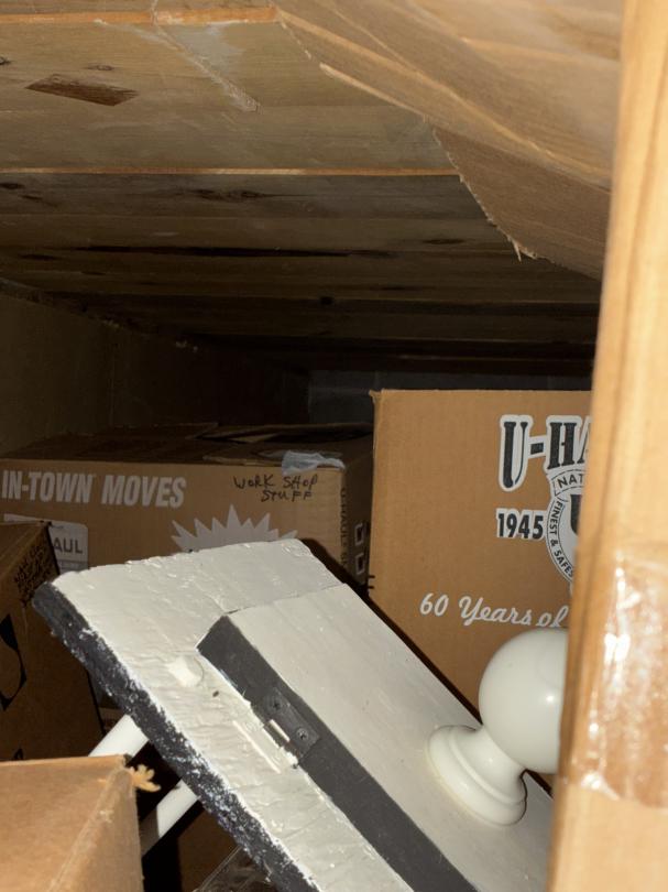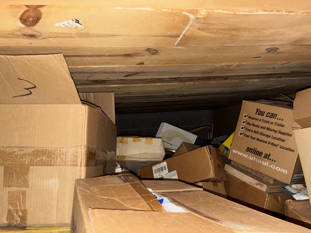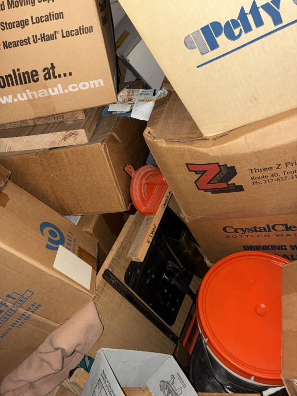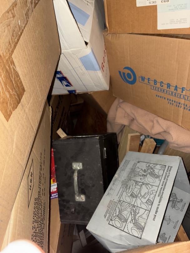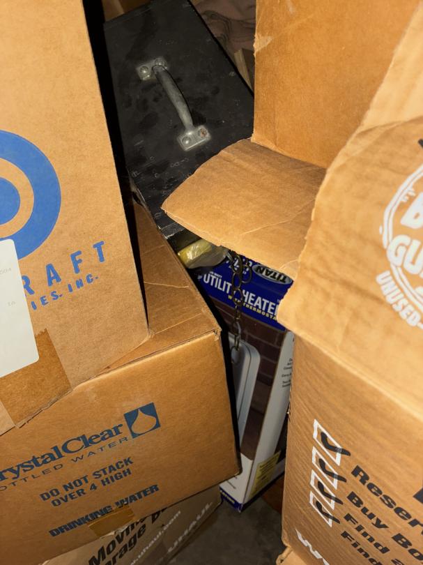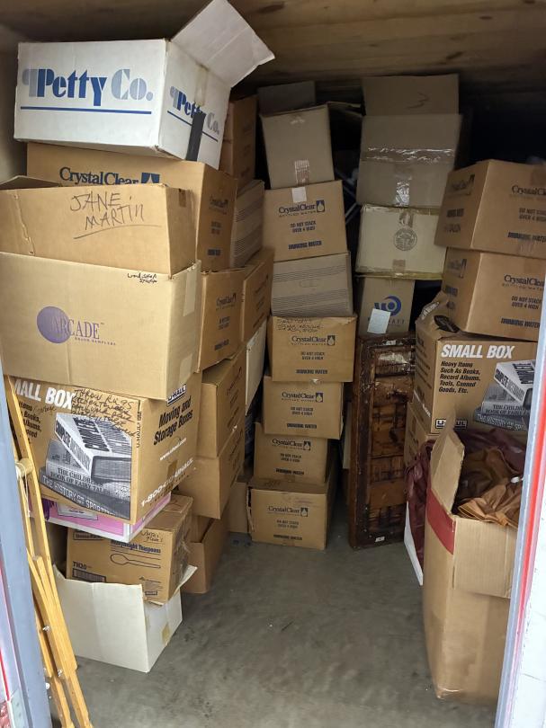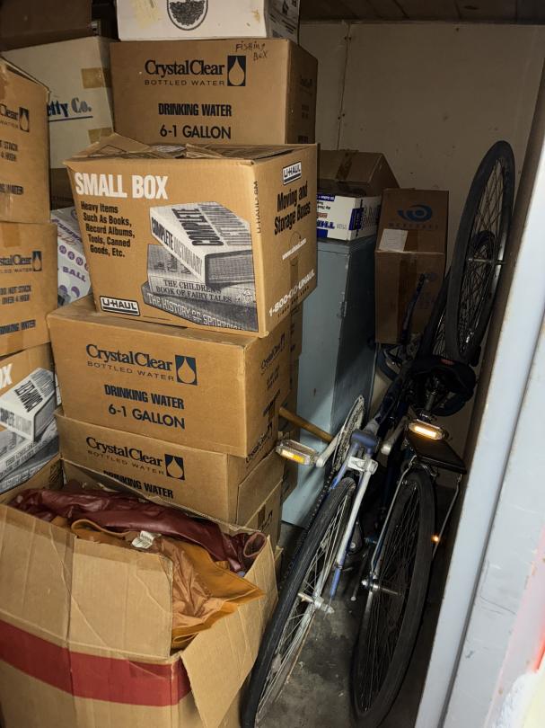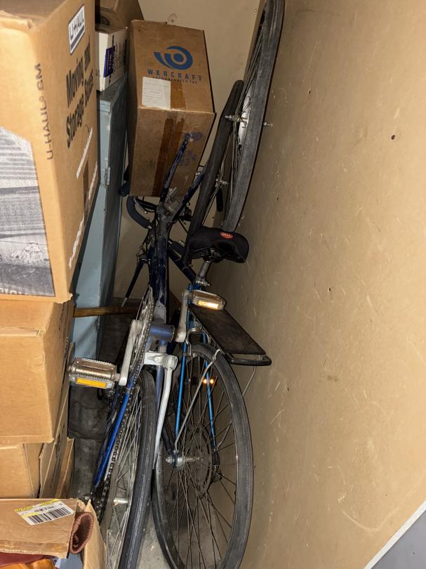This unit appears to contain…2 Bikes / Yard Shovel & Hoe Bench / Crutches / Tools Full of Boxes of Misc. household Items