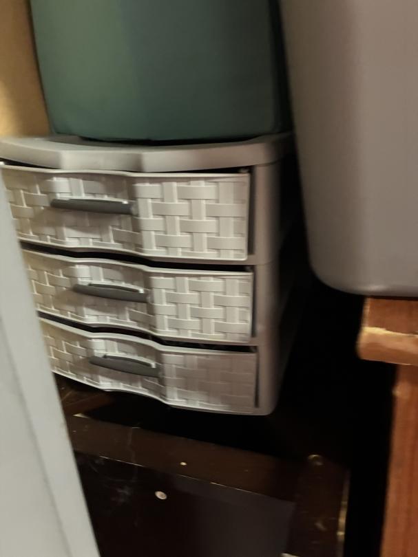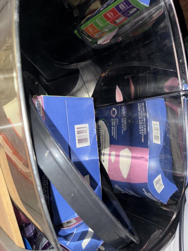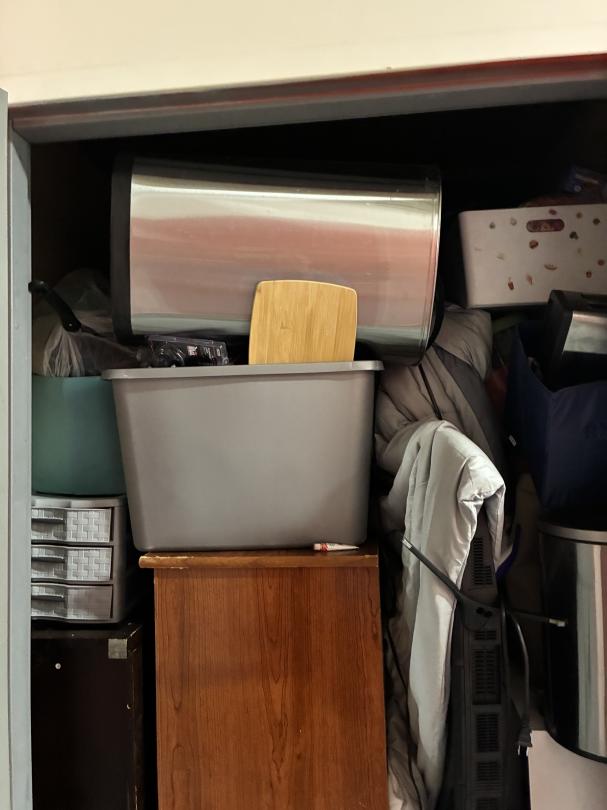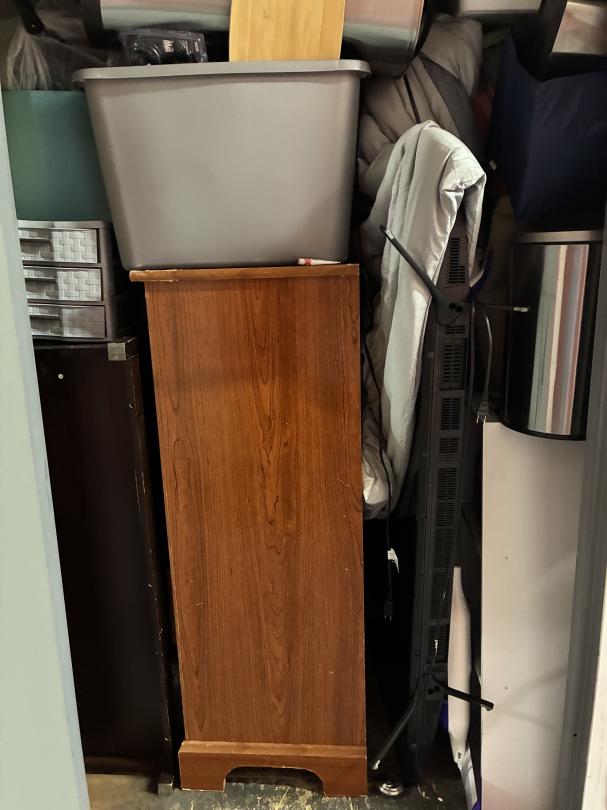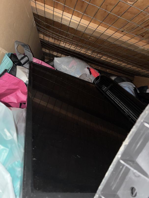 This unit appears to contain…3 TV's / Dressers / Shelves / kitchenware garbage cans / cleaning supplies full of boxes & totes of misc. items