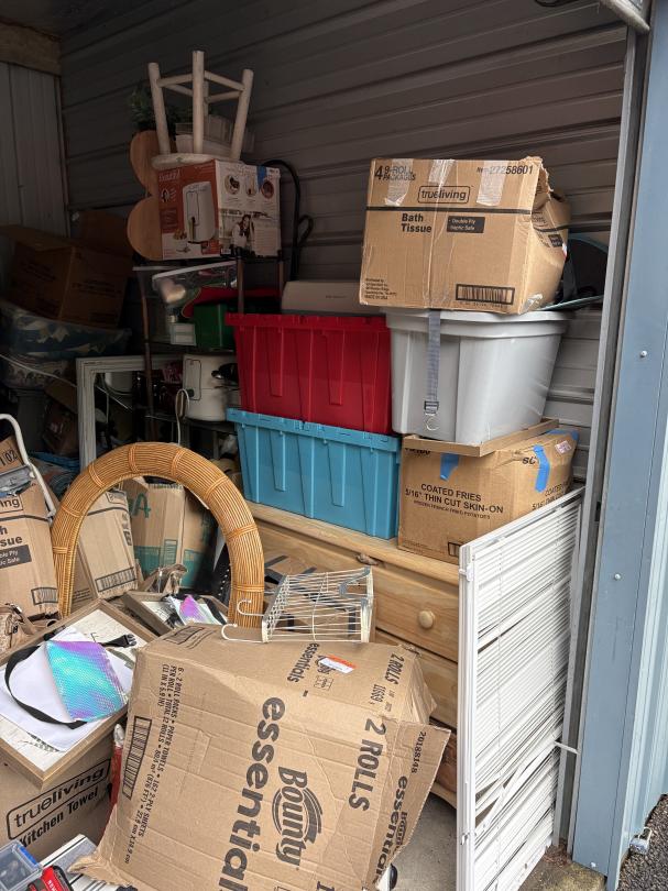 This unit appears to contain…Dresser, Nightstand, Power tools, Decor, Totes, Boxes
