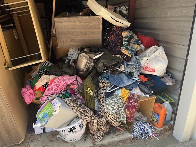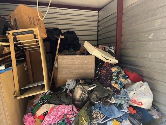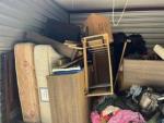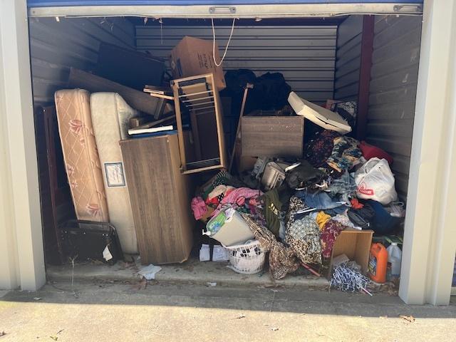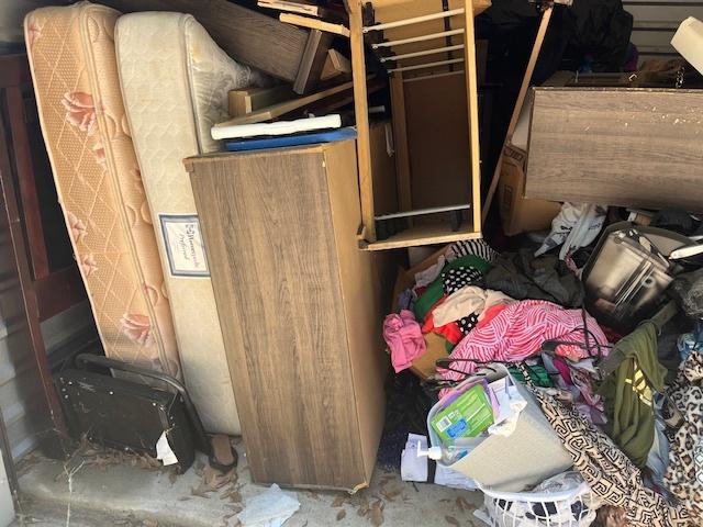 This unit appears to contain…Drive up Mattresses, Headboard, Dresser, Nightstand, Clothes, Coffee Maker, Bags, Purses, Totes, Boxes