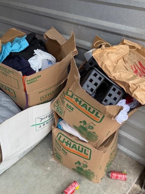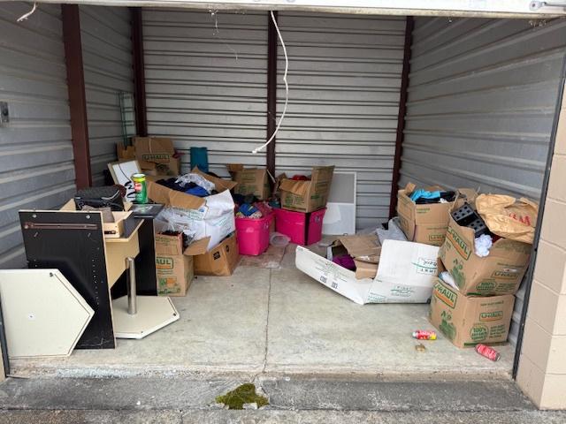 This unit appears to contain…This unit appears to contain: boxes, totes, clothes, shoes, table, and other misc items.