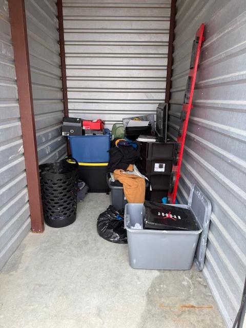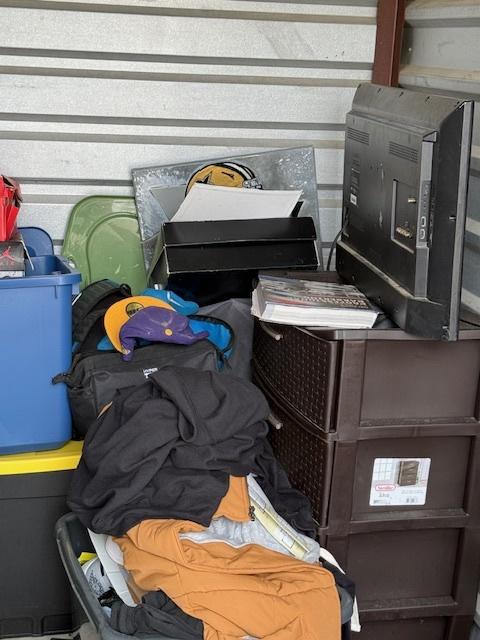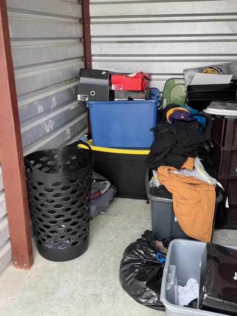 This unit appears to contain…This unit appears to contain: totes, clothes hamper, tv, plastic organizers, clothes, boxes, and other misc items.