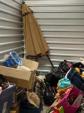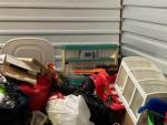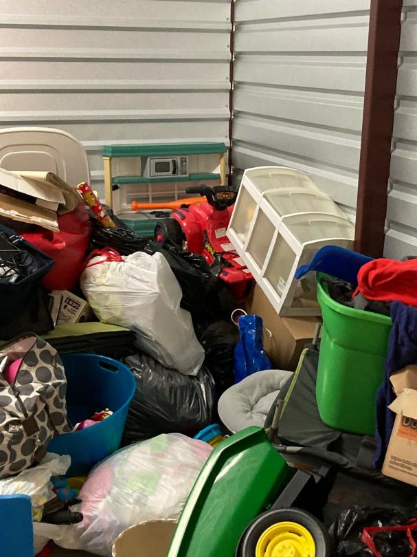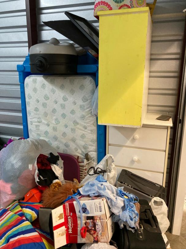 This unit appears to contain…climate control: 2 baby strollers, child dresser, toddler bed, clothes, child basketball goal, patio umbrella, bookcase, pack-N-play, toy 4-wheeler, bags, boxes, luggage, play kitchen, rocking horse, baby gate, plastic organizer/drawers