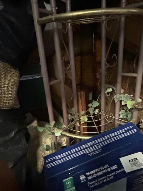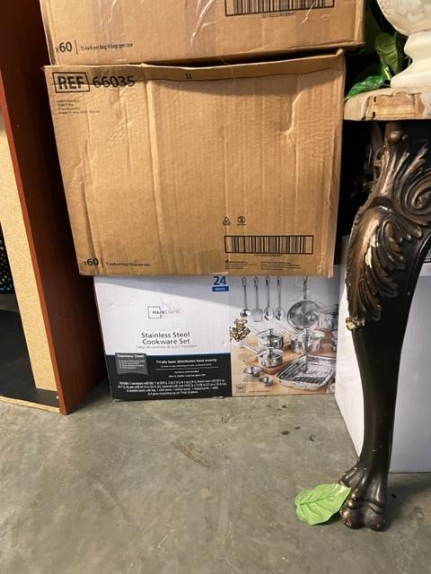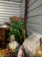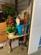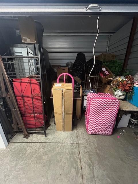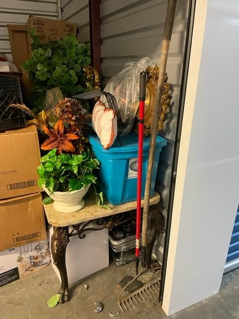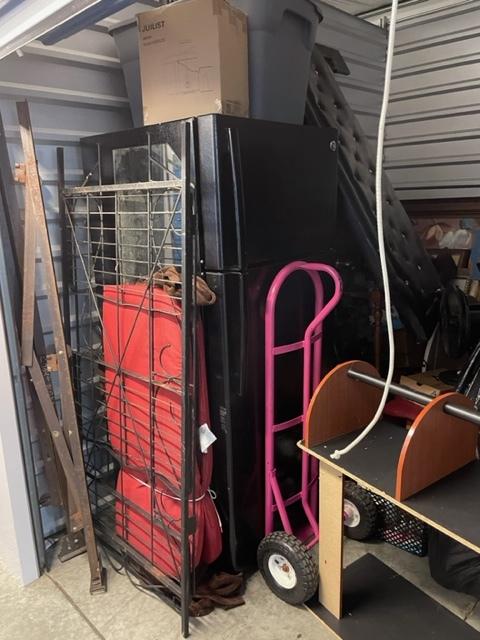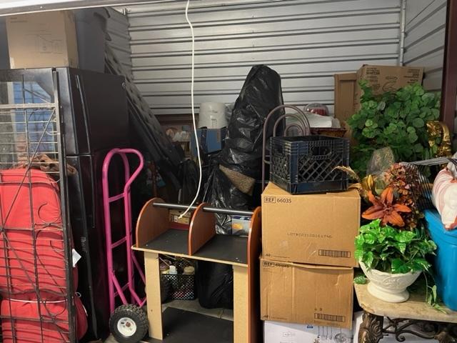 This unit appears to contain…GE refrigerator, luggage, yard tools, vases of flowers, artificial trees, area rug, pink moving dolly, baker's rack, shelving, clock, King size leather headboard, Christmas tree, night stand, trunk, 24 pc. cookware, glass table, wall art and Oster electric 12 inch skillet.