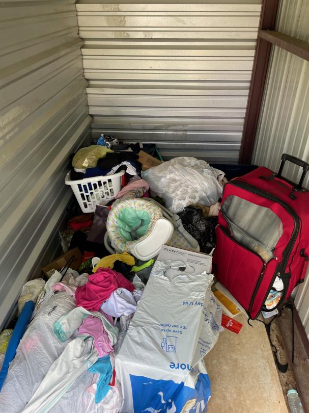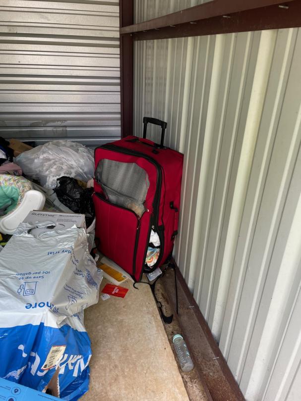 This unit appears to contain…drive up: clothes, walker, bags, luggage, boxes