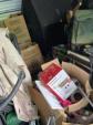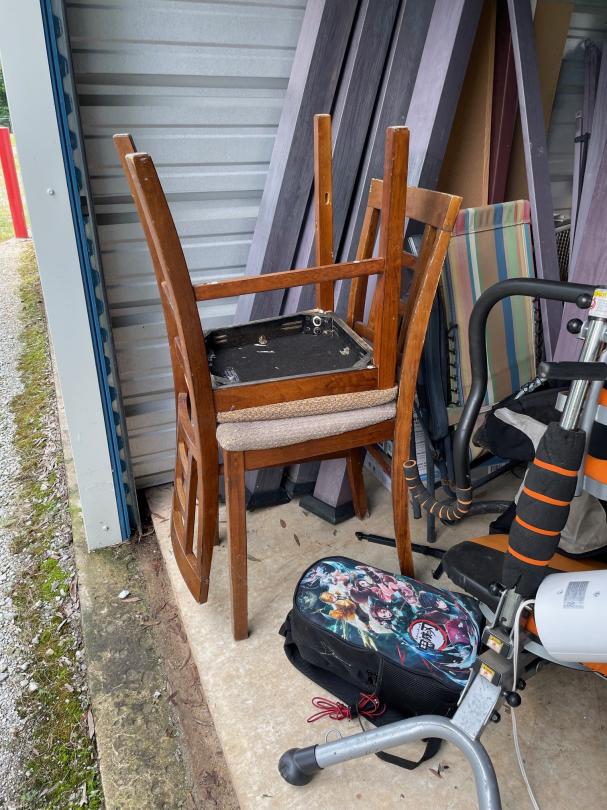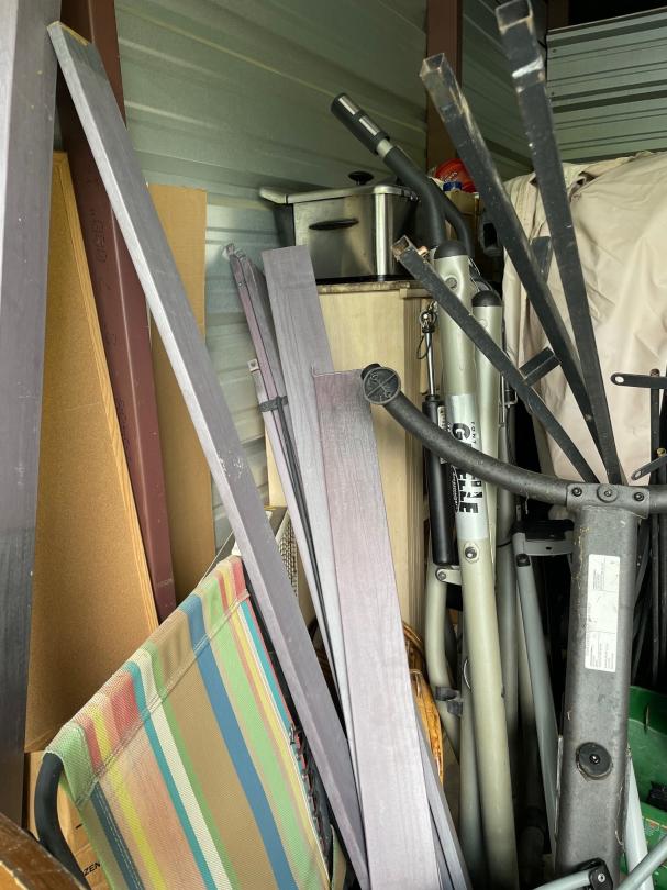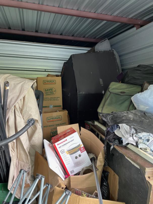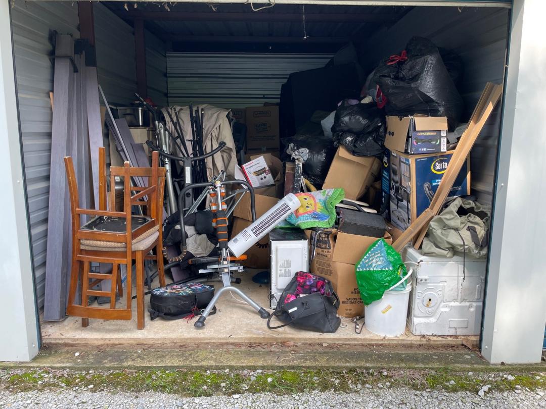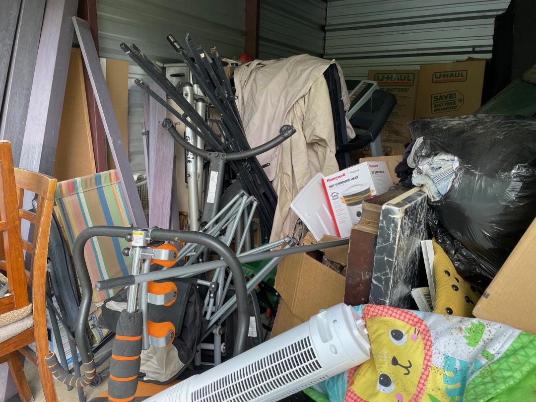 This unit appears to contain…Drive-up: work out equipment, microwave, chairs, bed frame, dresser, window unit, couch & loveseat, treadmill, fryer, table, bags of clothes, boxes, seed spreader