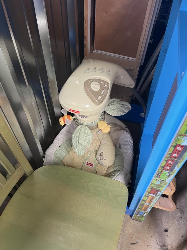This unit appears to contain…climate controlled end table, chair, train table, drum, clothes baskets, boxes, bags, toaster oven