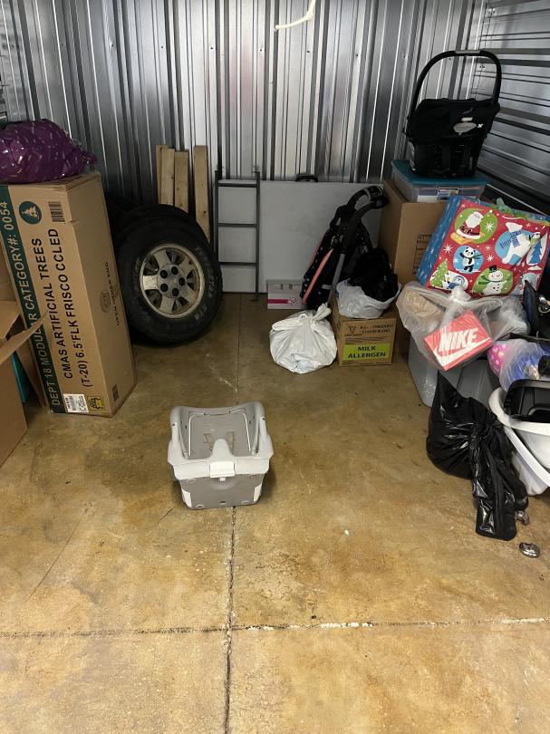 This unit appears to contain…climate controlled baby furniture, boxes, baby bathtub, shelf, folding table, strollers, wood slats.
