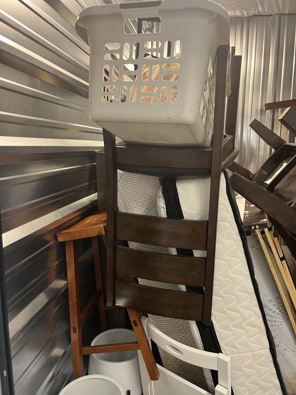 This unit appears to contain…climate controlled mattress, box springs, chairs, home decor, stool, dryer, bed frame, tv, twin bed