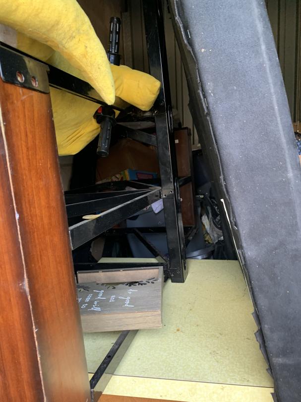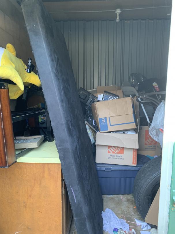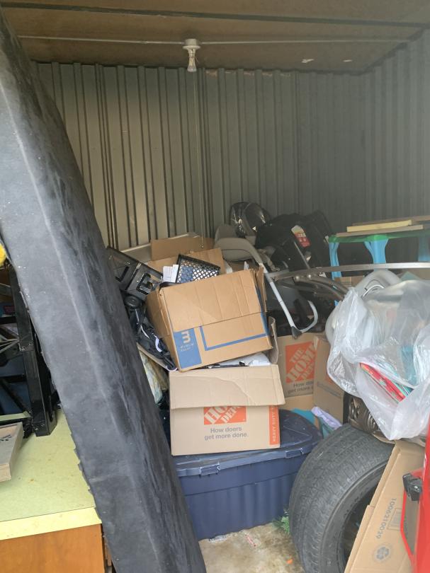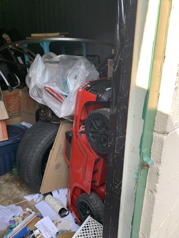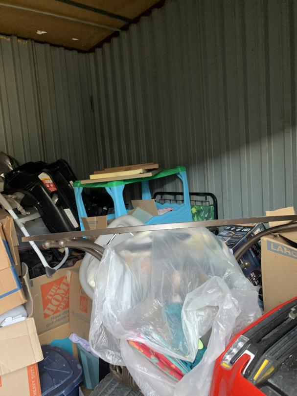 This unit appears to contain…BED RAILS, BOXES, TOYS, TV STAND, RIDE ON CAR, TIRE, HIGHCHAIR, TOTES