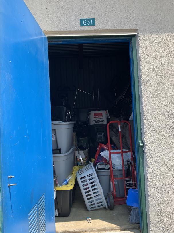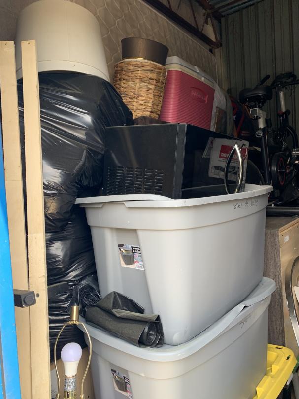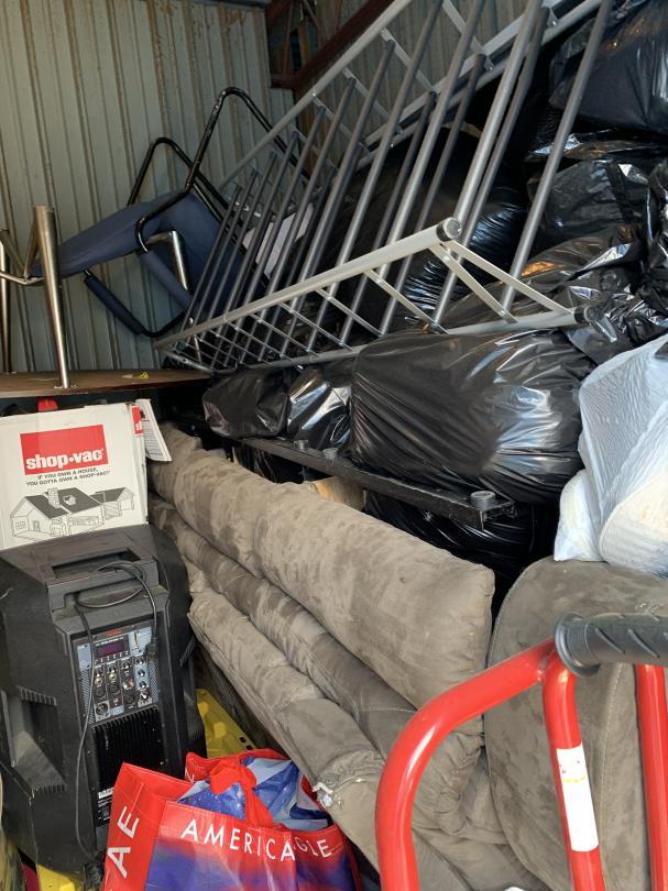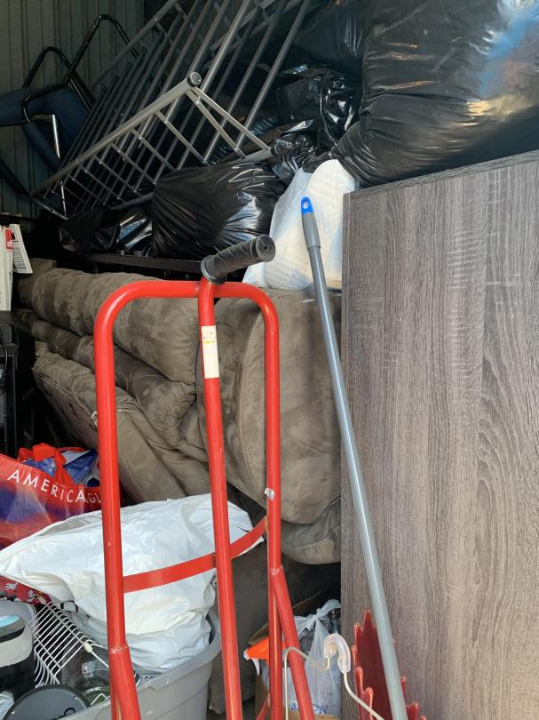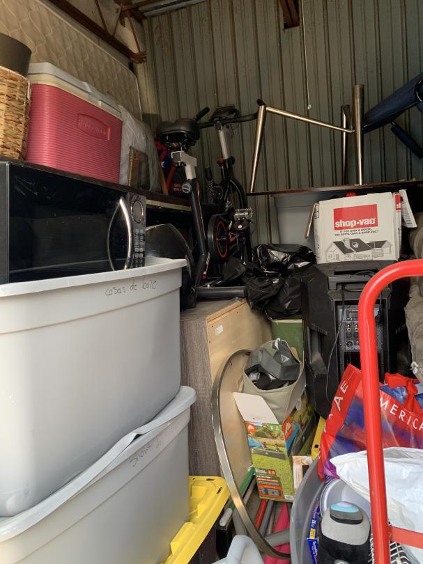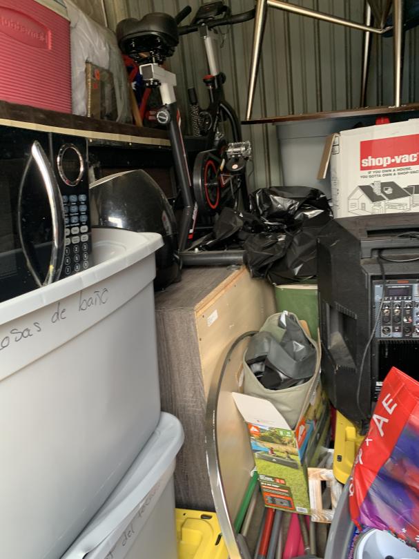 This unit appears to contain…CHAIR, TABLE, COUCH, BAGS, BOXES, DOLLY, SPEAKER, EXERCISE BIKE, DRESSER, TOTES