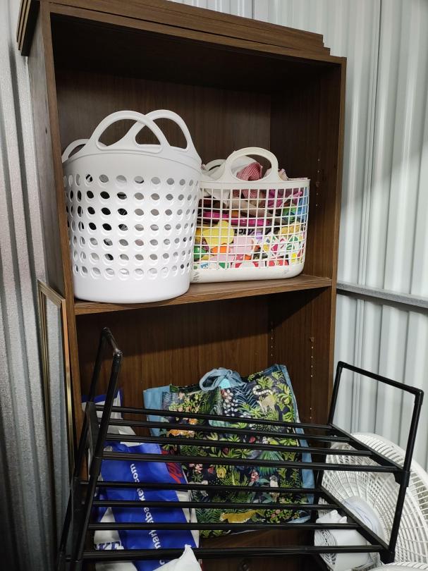 This unit appears to contain…Fans Shoe Rack Shelving Unit Dresser Entertainment Stand Duffel Bag Mystery Box