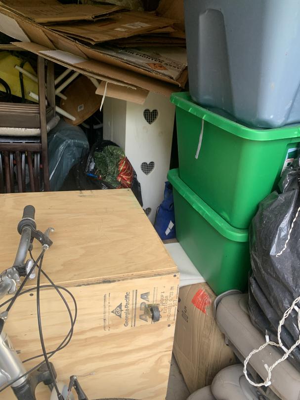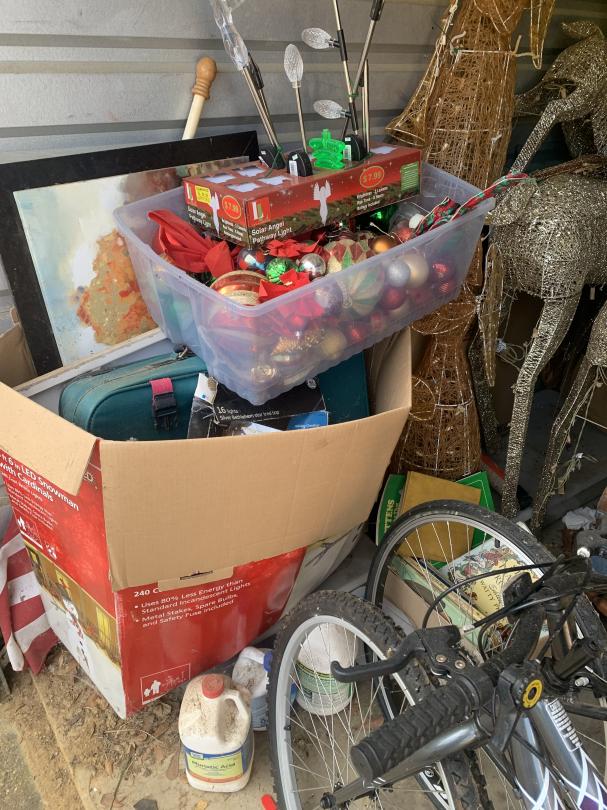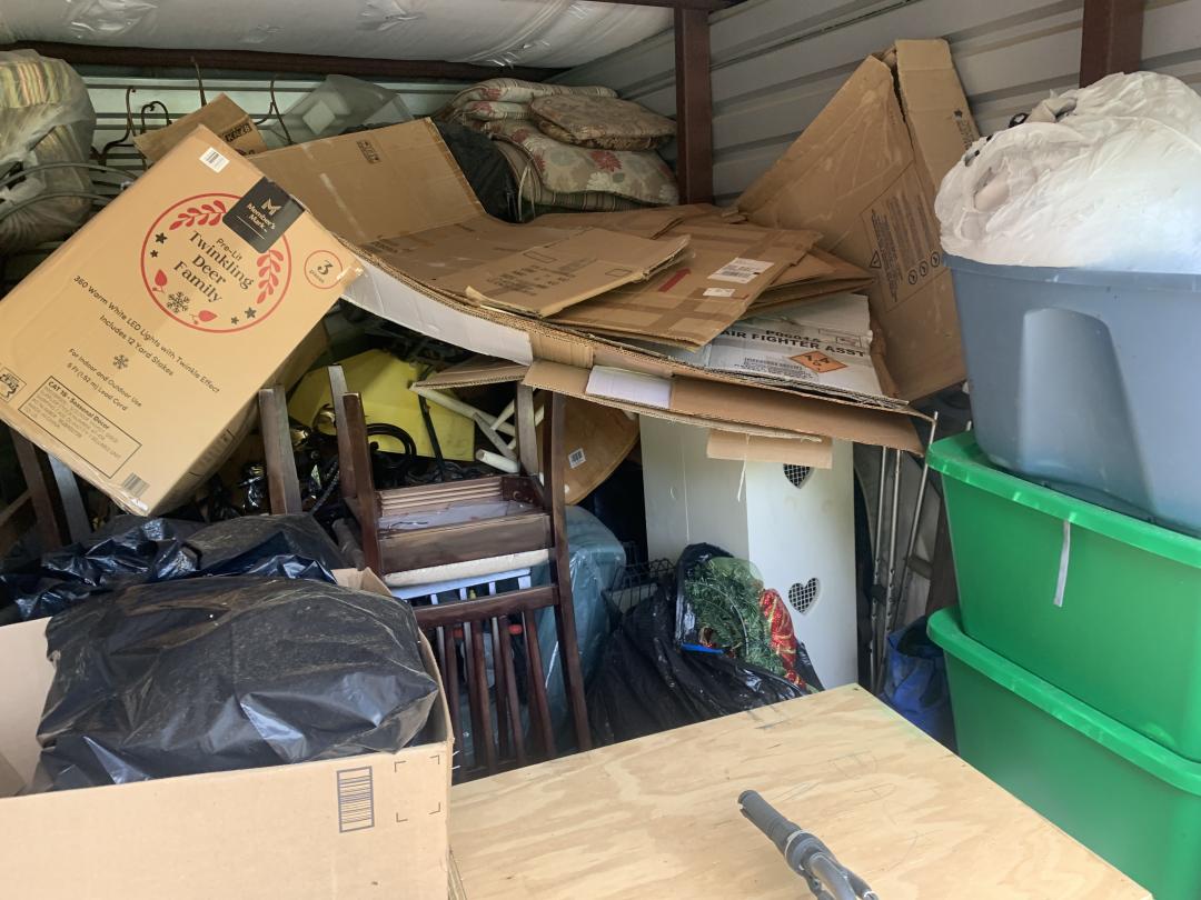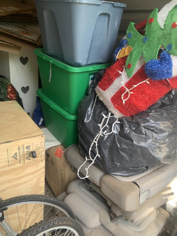 This unit appears to contain…Unit Contains: 2 Mountain Bike Christmas Decor Yard Luggage Home Decor Rocking Chair Car Seats Golf Clubs Chairs End Tables Patio Cushions Misc Totes