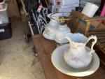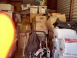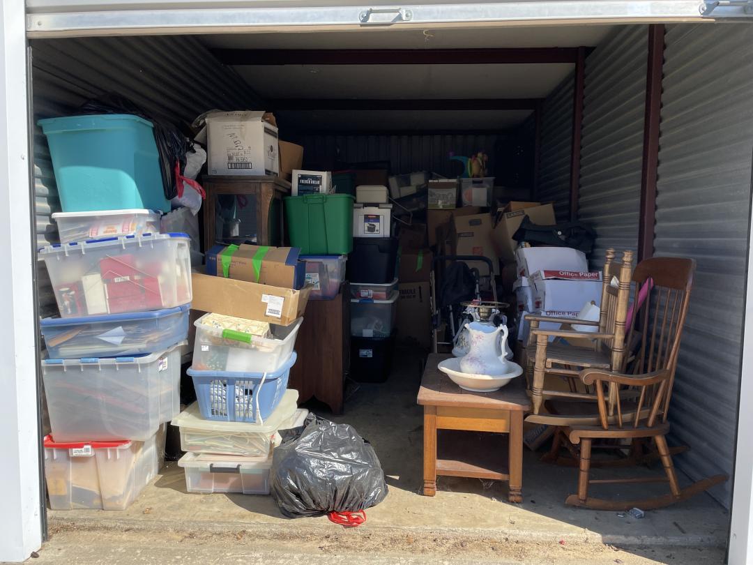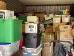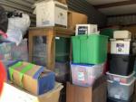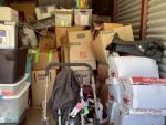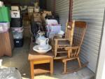 This unit appears to contain…child rocking chair, rocking chair, stroller, car seat, baby bouncer, baby walker, coffee table, nightstand, china cabinet, table lamp, water picture and bowl, suitcases, fire lockbox, wall art, wall pictures, books, Christmas decorations, 2 filing boxes, miscellaneous totes, miscellaneous boxes