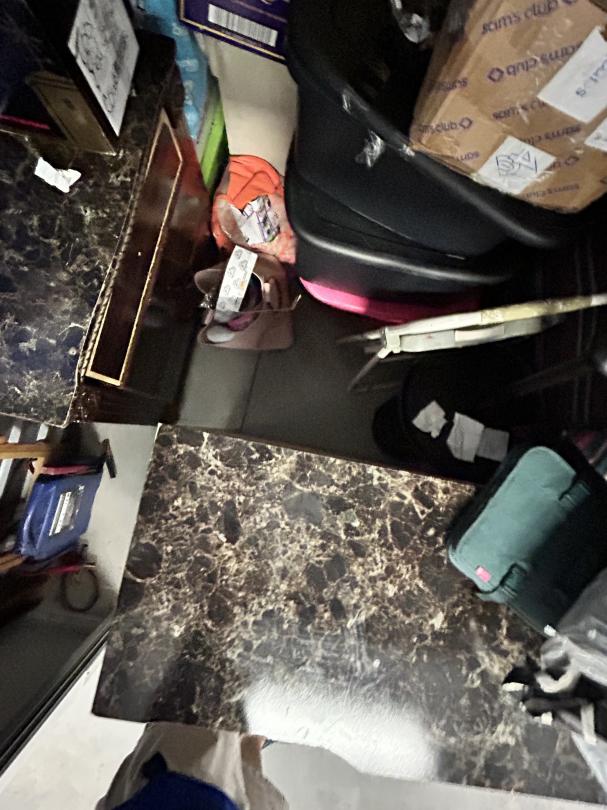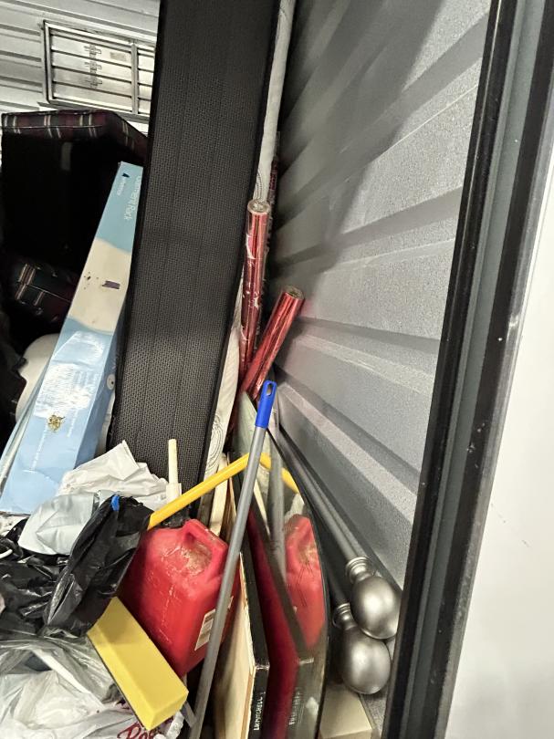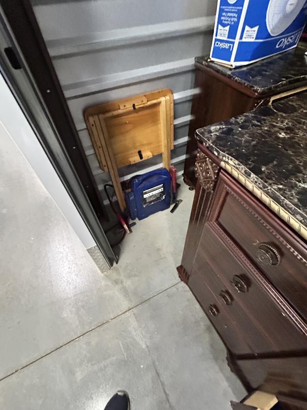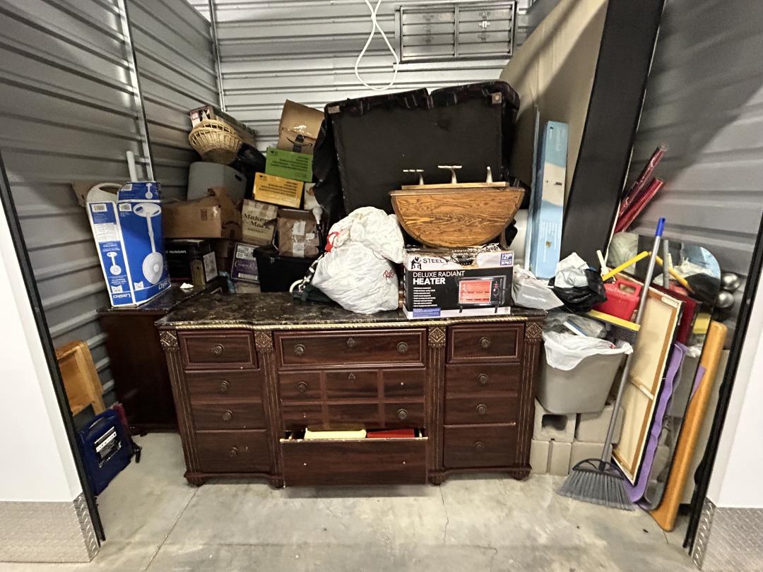This unit appears to contain…Contents of this unit are as follows lamp king mattress and boxes springs, Dresser with a marble top, end tables, mirror, jump box, fan, electric heater, cleaning supplies, decor, boxes , totes, wicker baskets and 2 couches.