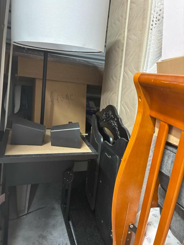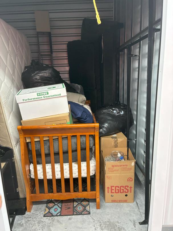 This unit appears to contain…Crib-Day Bed / Mattress, box spring, & frame / dresser / night stand / lamps wood table & chairs / coffee table / end table / pictures / mirrors / bedding bathroom stuff / un-sued canvas's