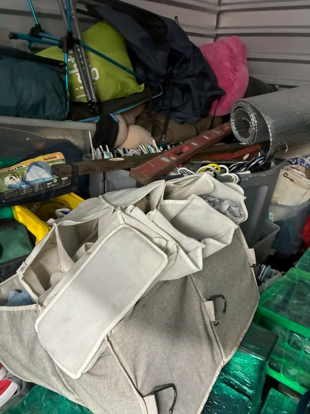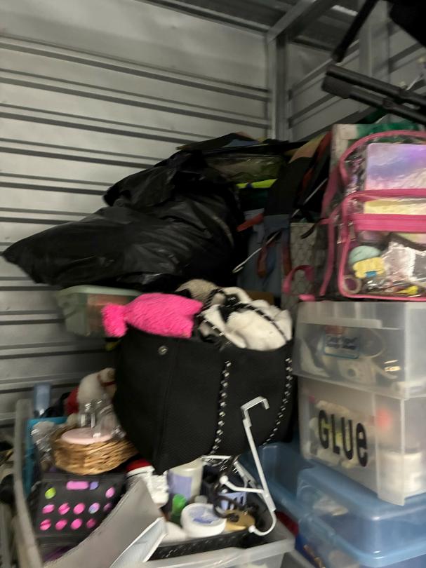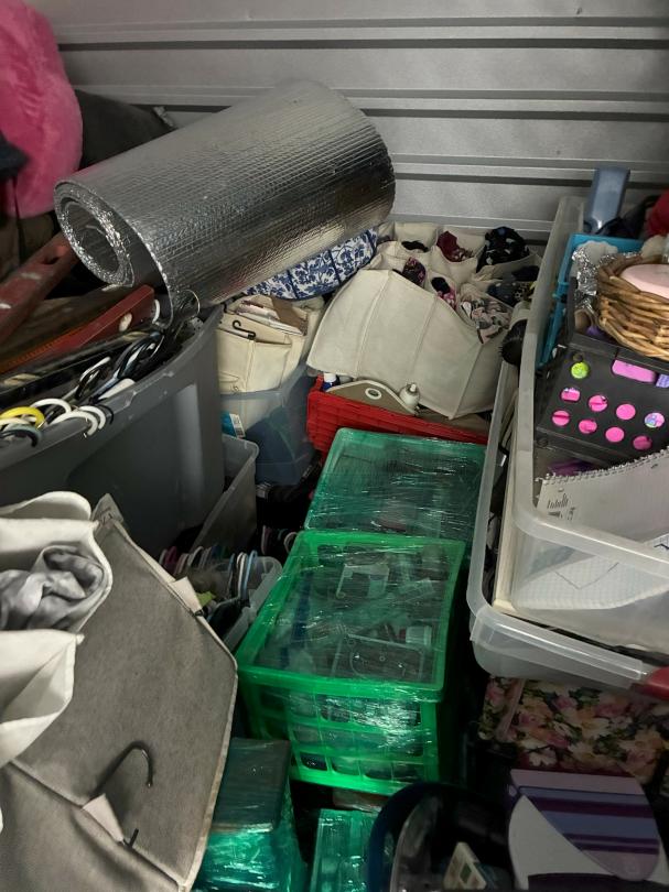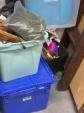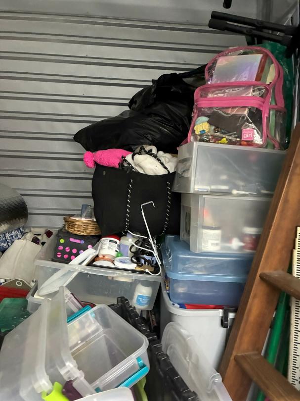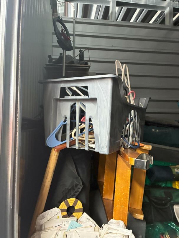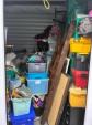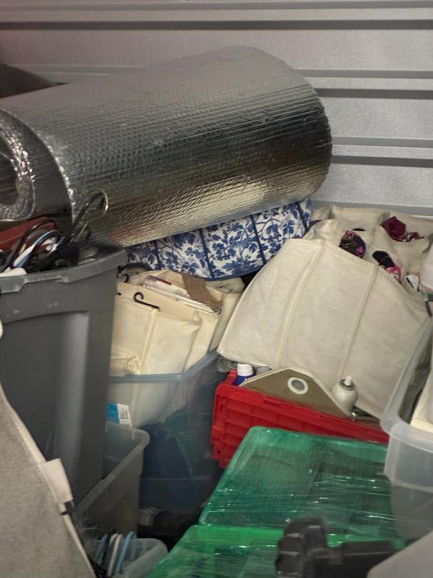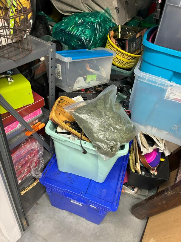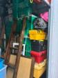 This unit appears to contain…4 tool boxes / hard hat / file cabinet / multiple shelves / shoes / art case / walking stick & multiple crates & totes of misc. household items