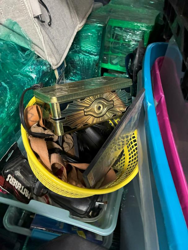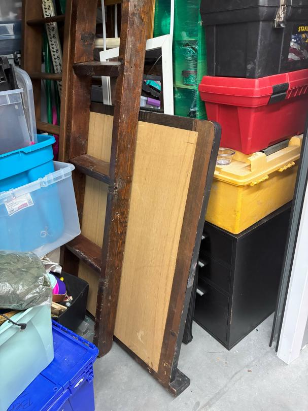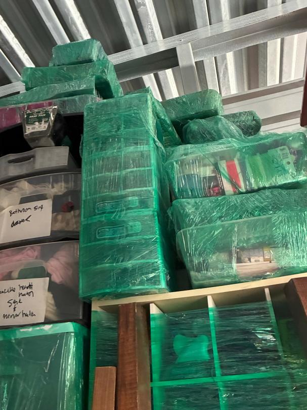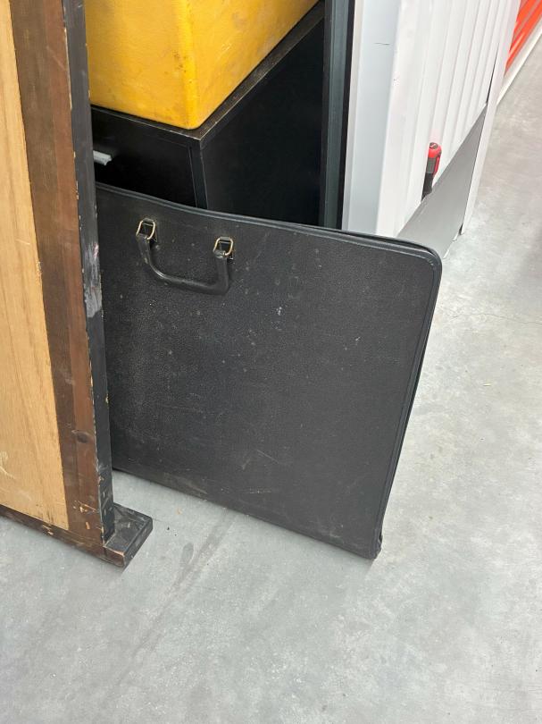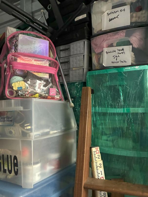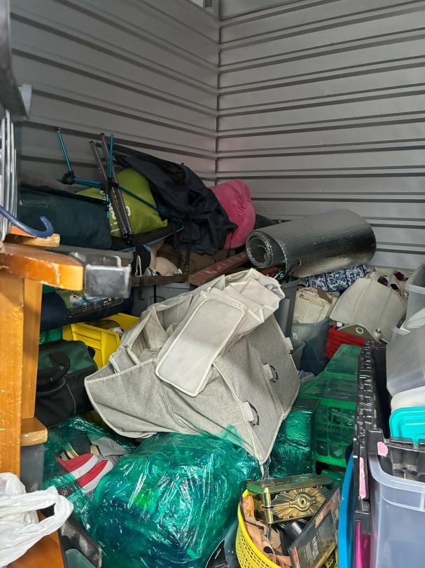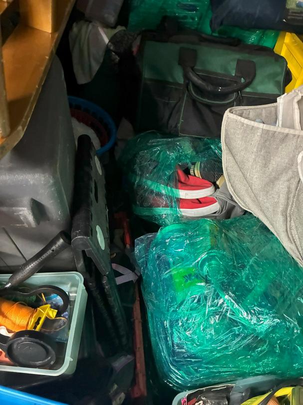 This unit appears to contain…4 tool boxes / hard hat / file cabinet / multiple shelves / shoes / art case / walking stick & multiple crates & totes of misc. household items