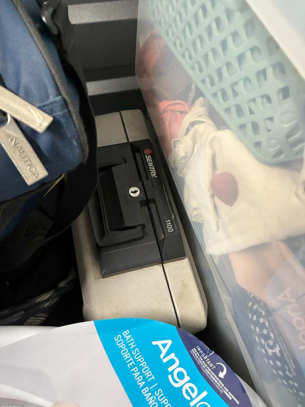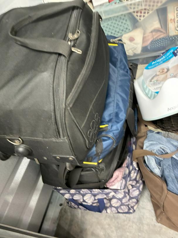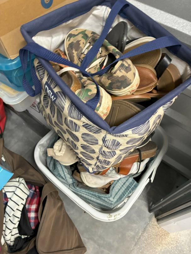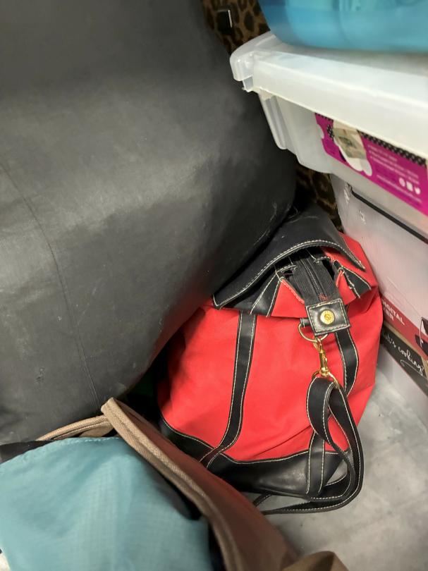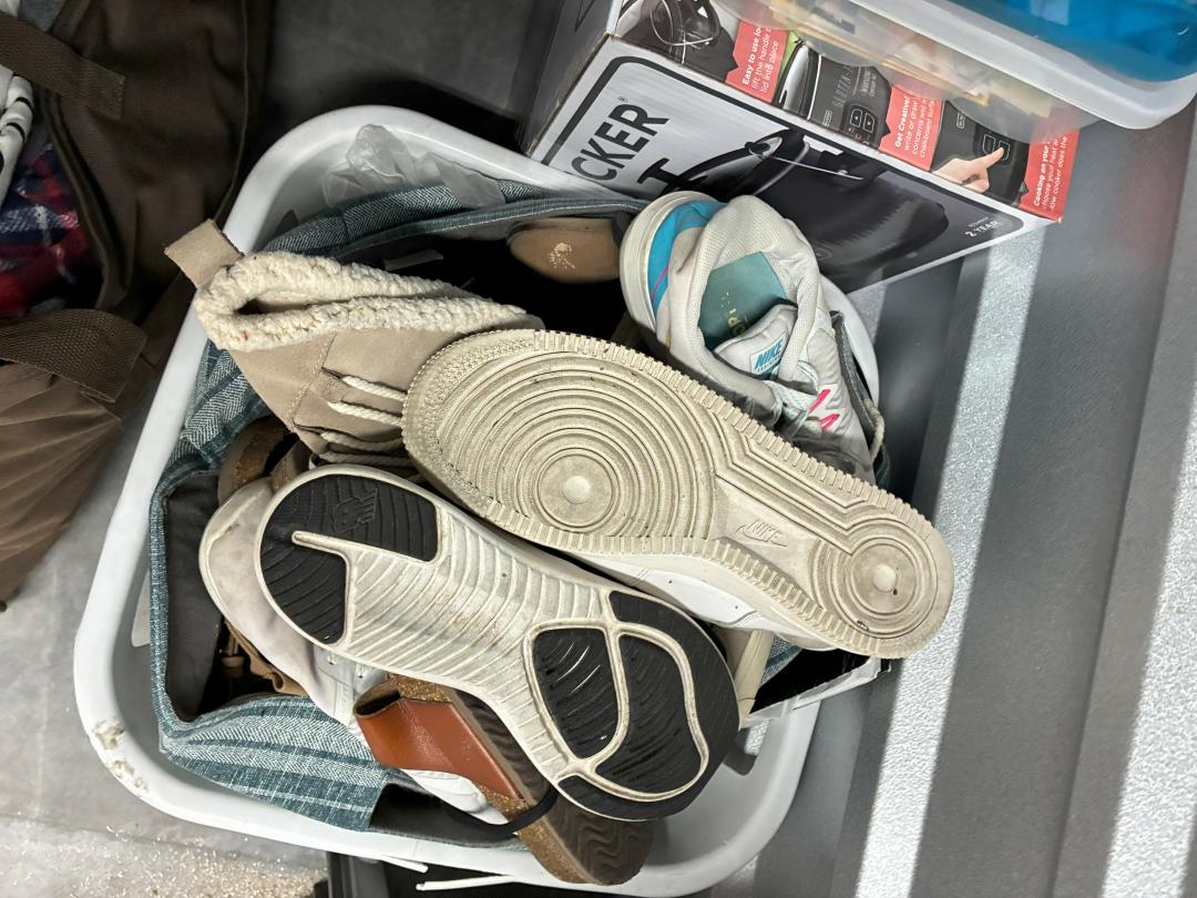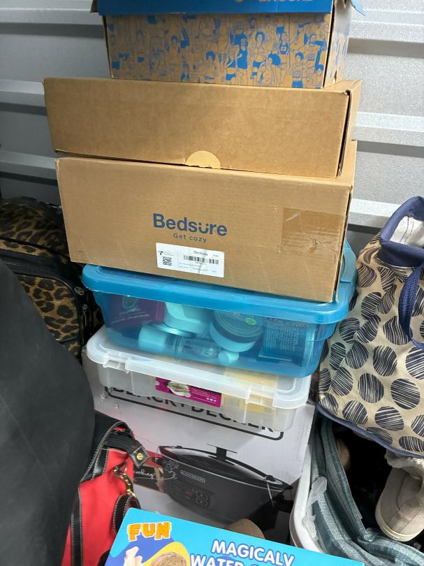 This unit appears to contain…SAFE / PILLOWS / CLOTHS / SHOES / PURSE / CROCK POT / BAG OF LUBE & SEX TOYS