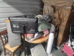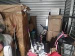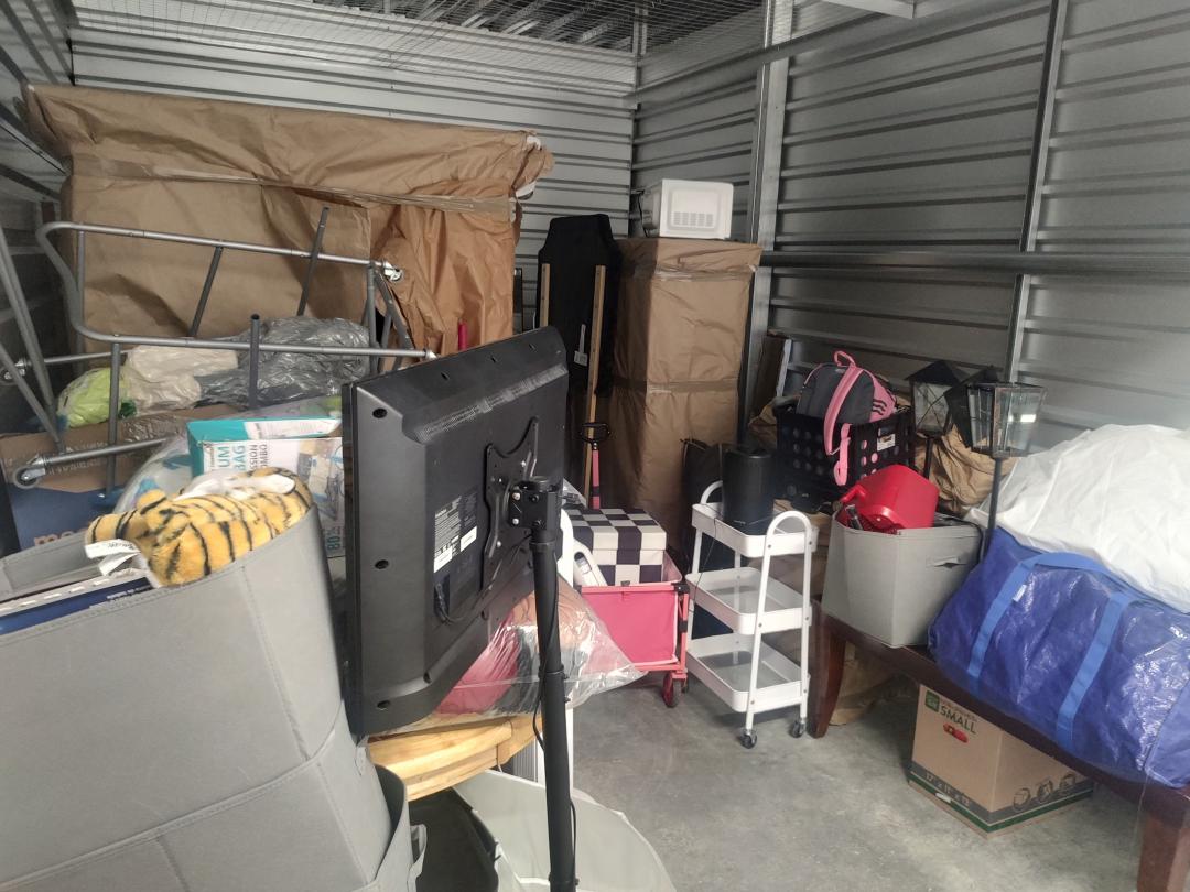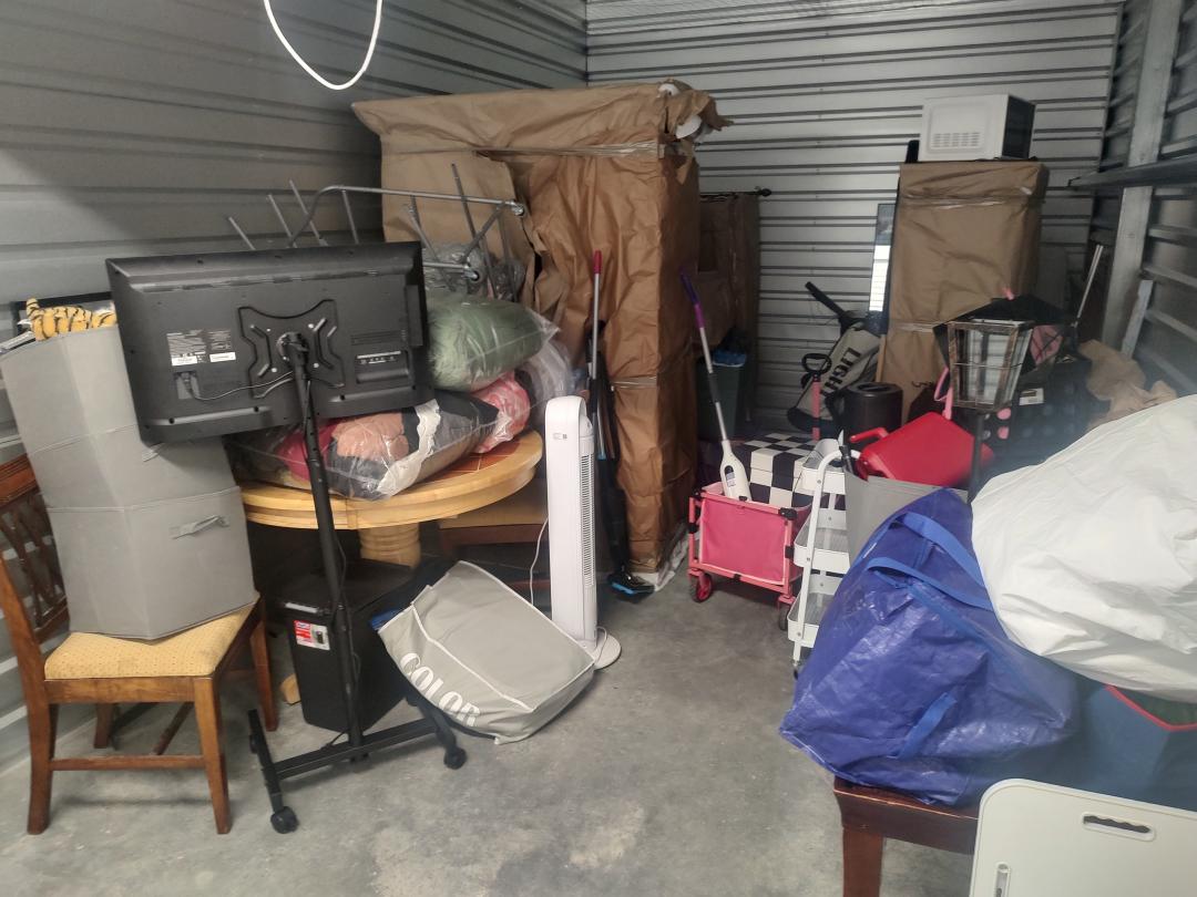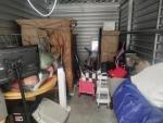 This unit appears to contain…coffee table mirror large 2 chairs round table baby matress boots crock pot warmer boxes several peices of large wooden furniture baby slay bed iron sconces crutches small suitcases tv flatscreen misc. totes Bedding air fryer large dresser kids toys rolling carts clothing microwave