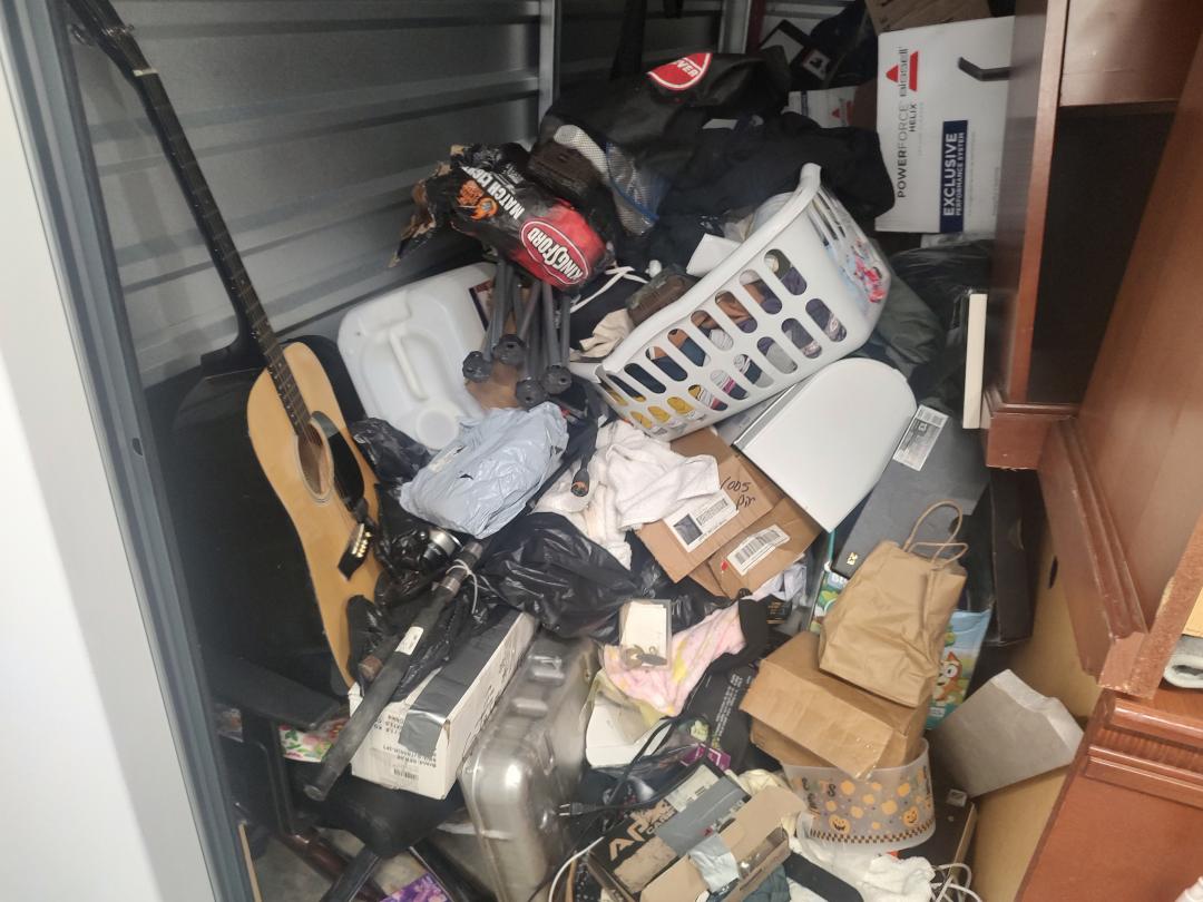 This unit appears to contain…Wrapping Paper targets end table acoustic guitar (2) shelving desk chair misc. totes and boxes clothing fishing poles & reels Hat