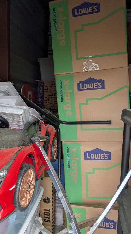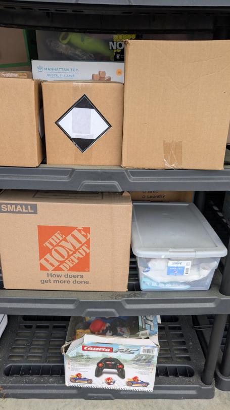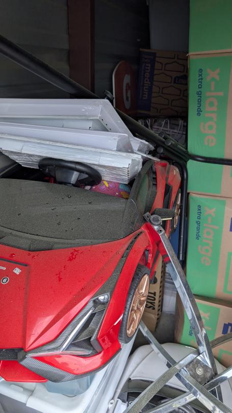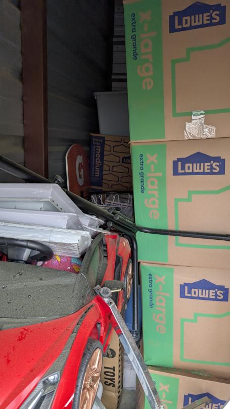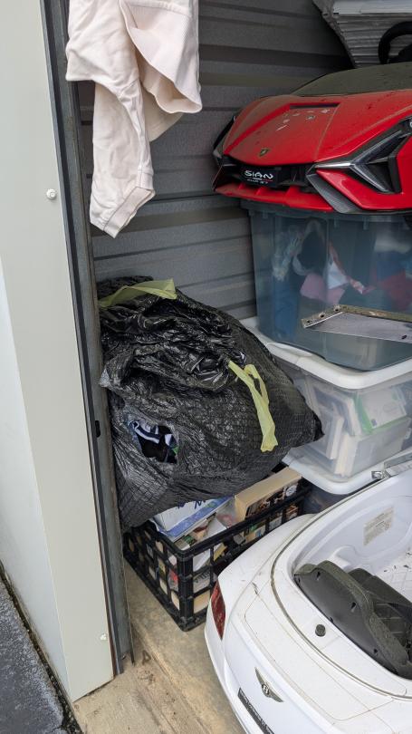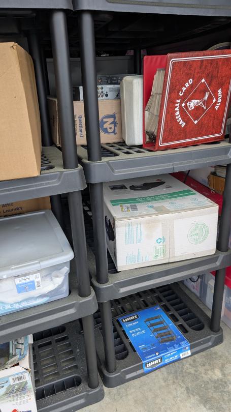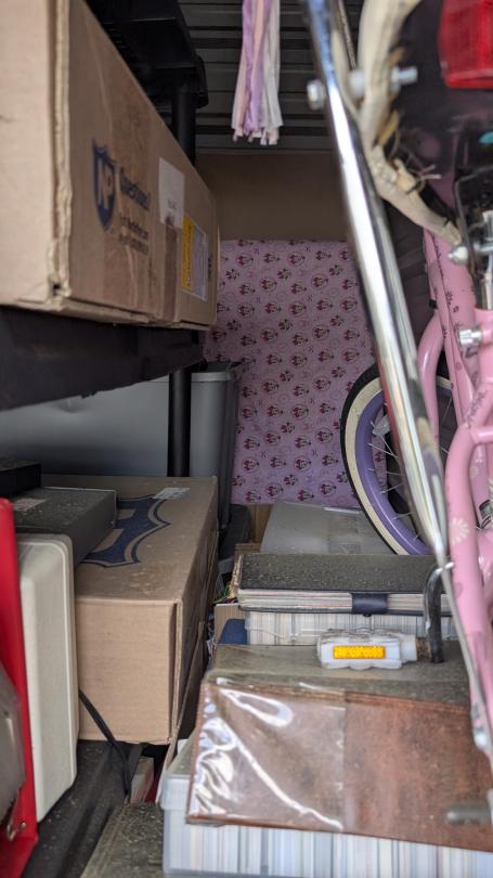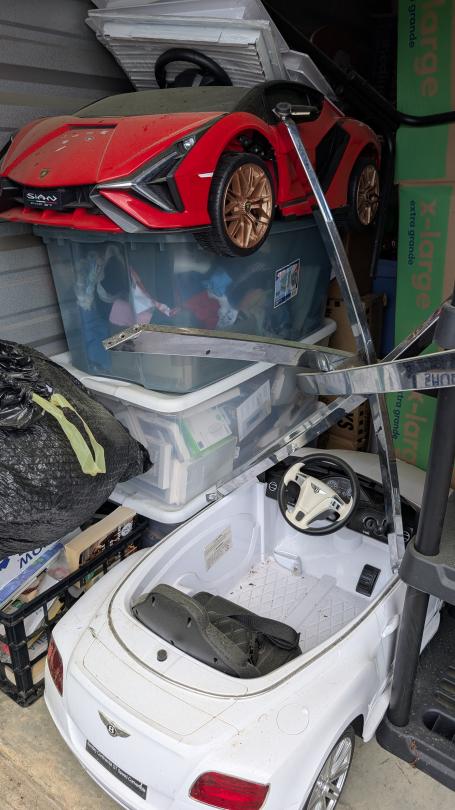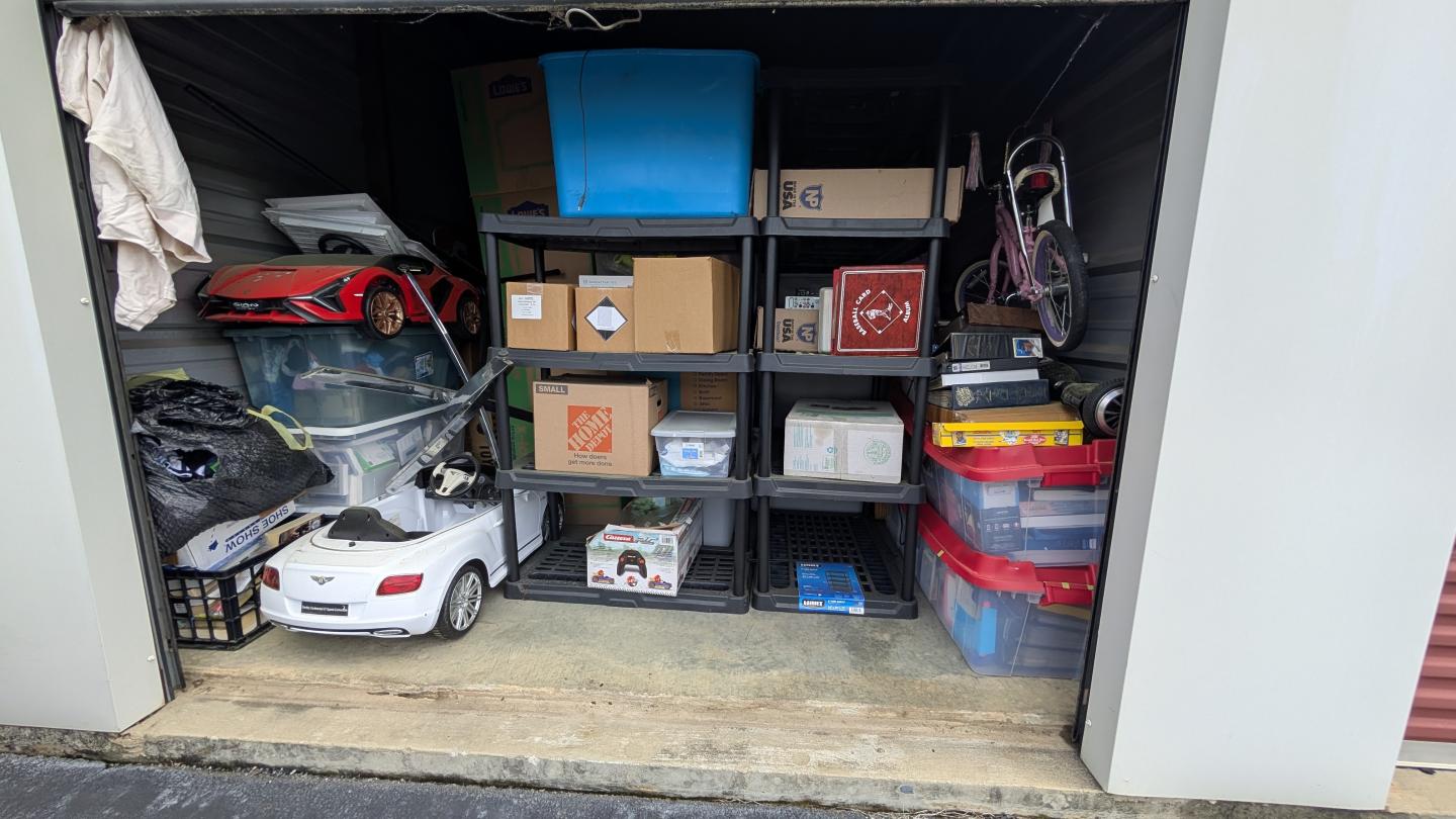 This unit appears to contain…2 POWERWHEEL CARS, SHELVES, TOTES, BOXES, BIKE, BAGS, PHOTO ALBUMS, BASEBALL CARD BINDER ETC