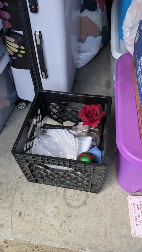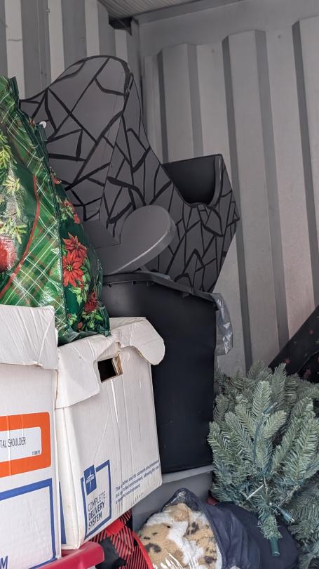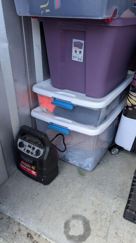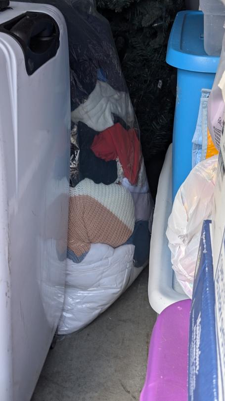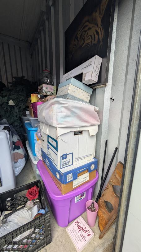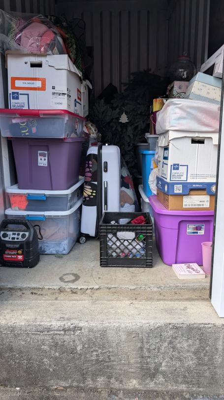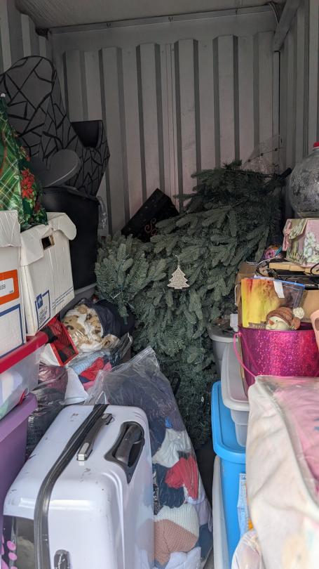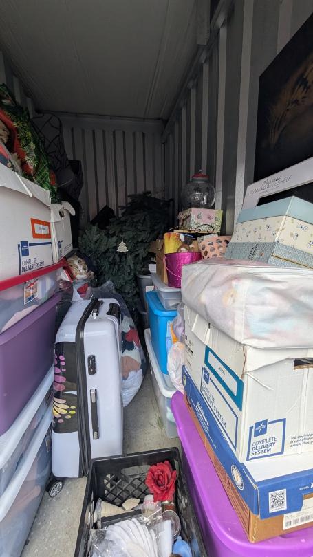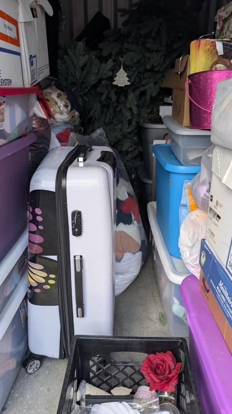 This unit appears to contain…SUITCASE, TOTES, BOXES, BAGS, CHRISTMASS TREE, SHELVES, CLOTHES, SUPER START POWER PACK JUMP STARTER, ETC